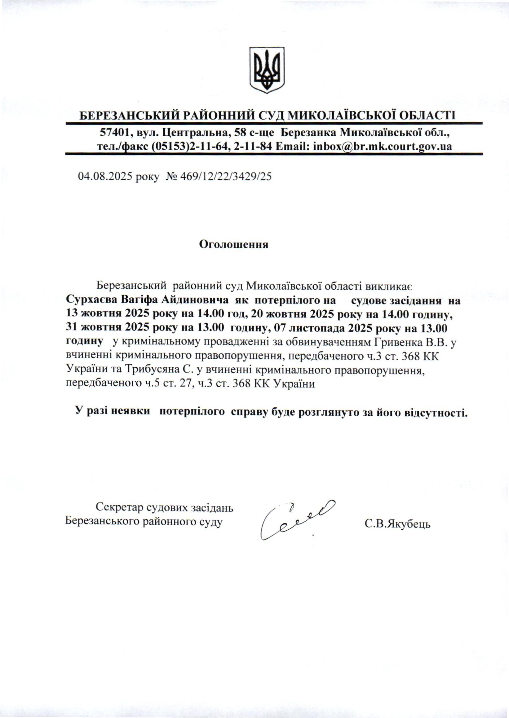 Виклик до суду Сурхаєва В.А.