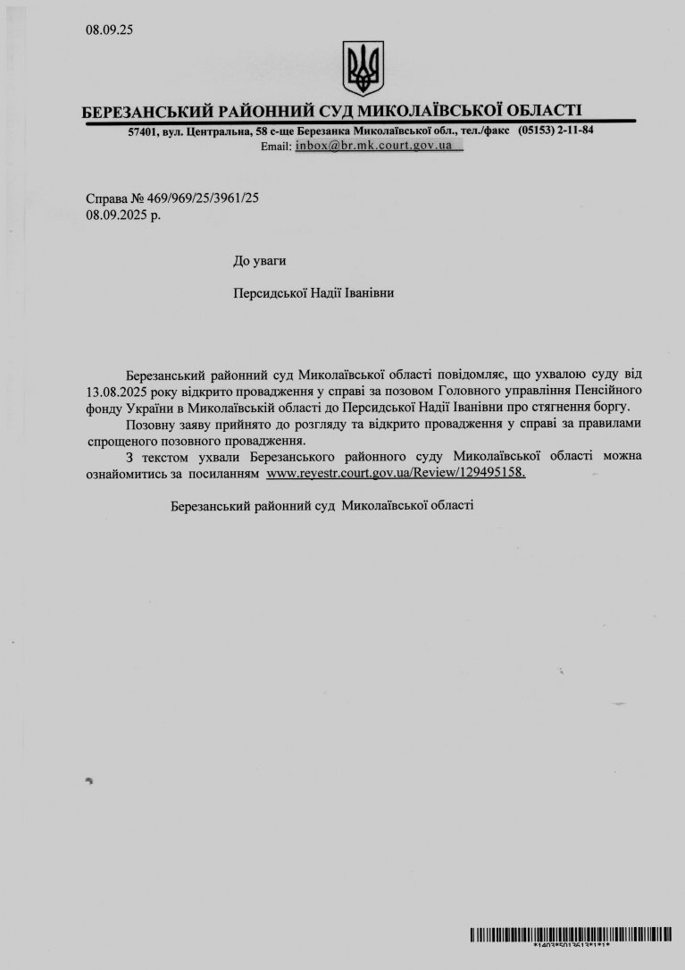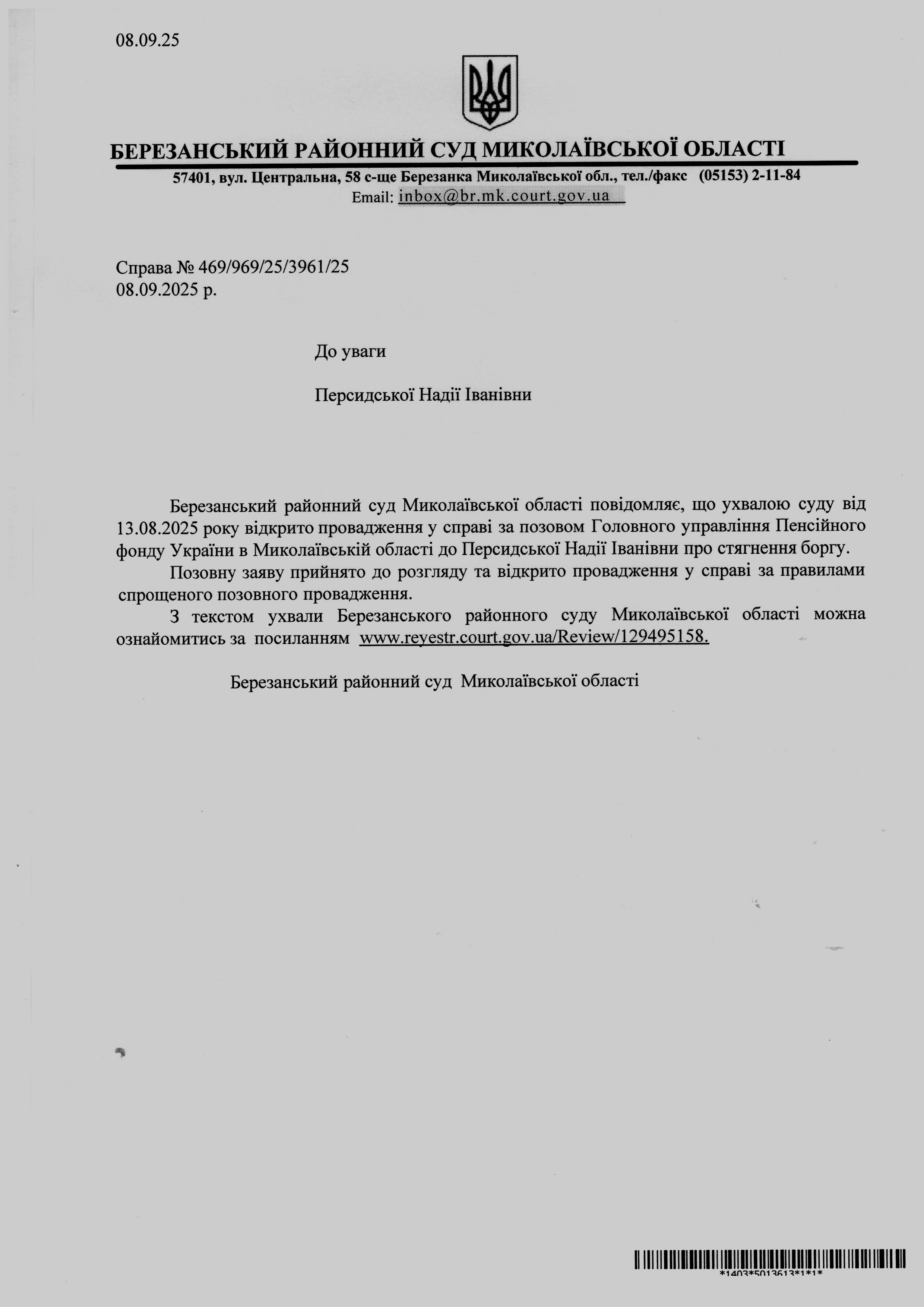 Виклик до суду Персидська Н.І.