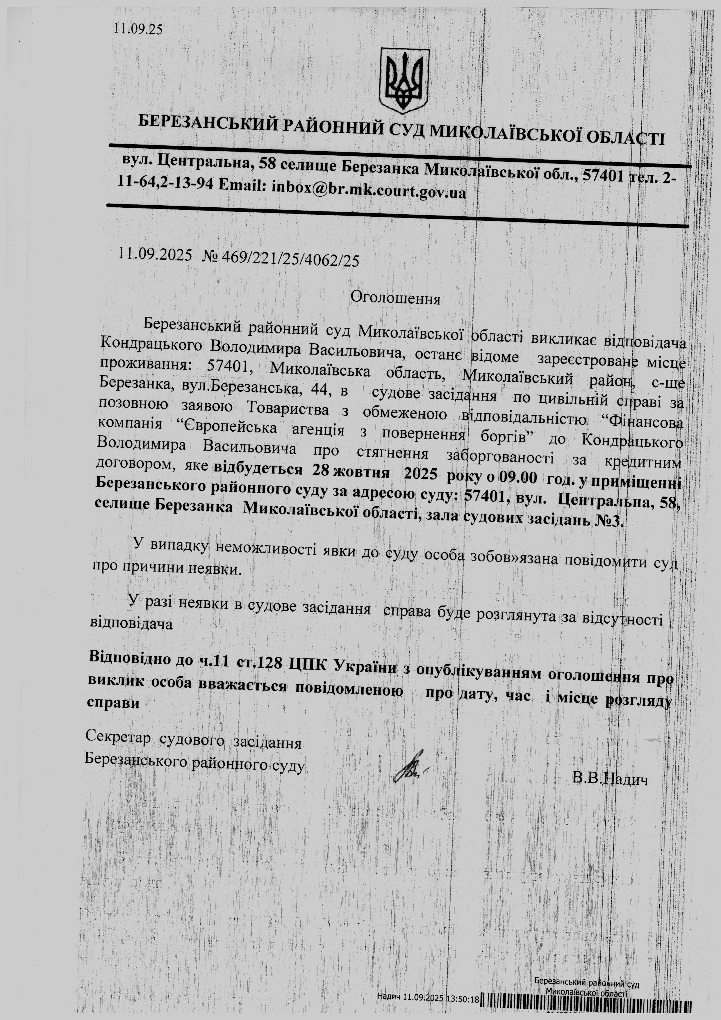 Виклик до суду Кондрацького В.В.