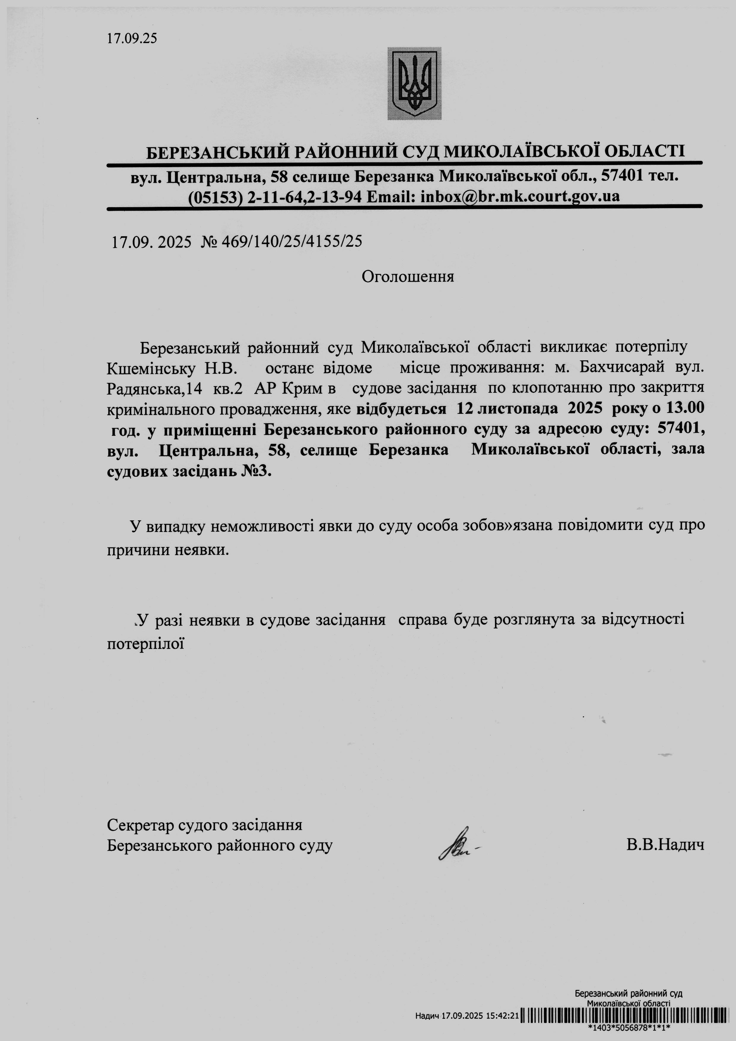 Виклик до суду Кшемінську Н.В.