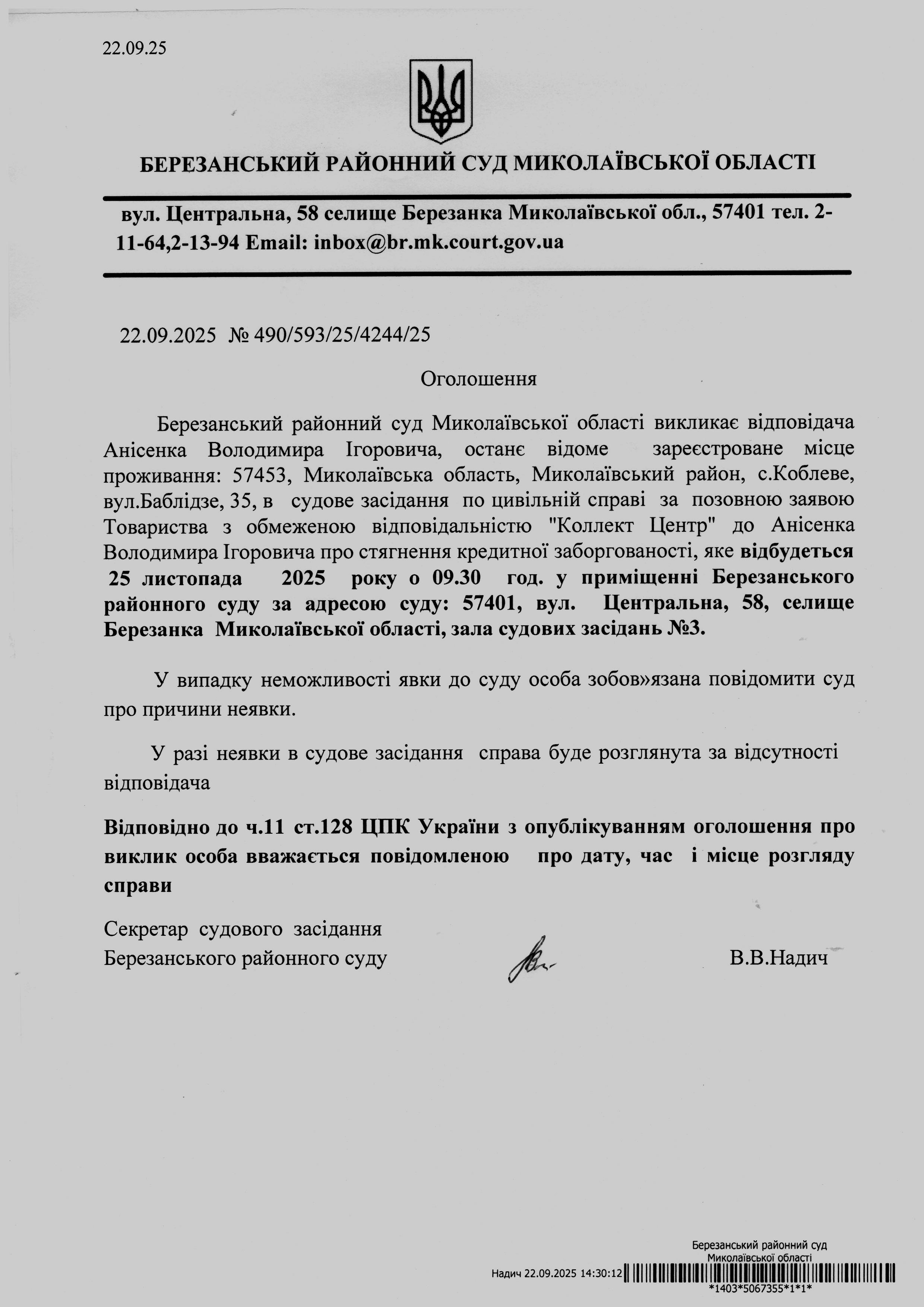 Виклик до суду Анісенка В.І.