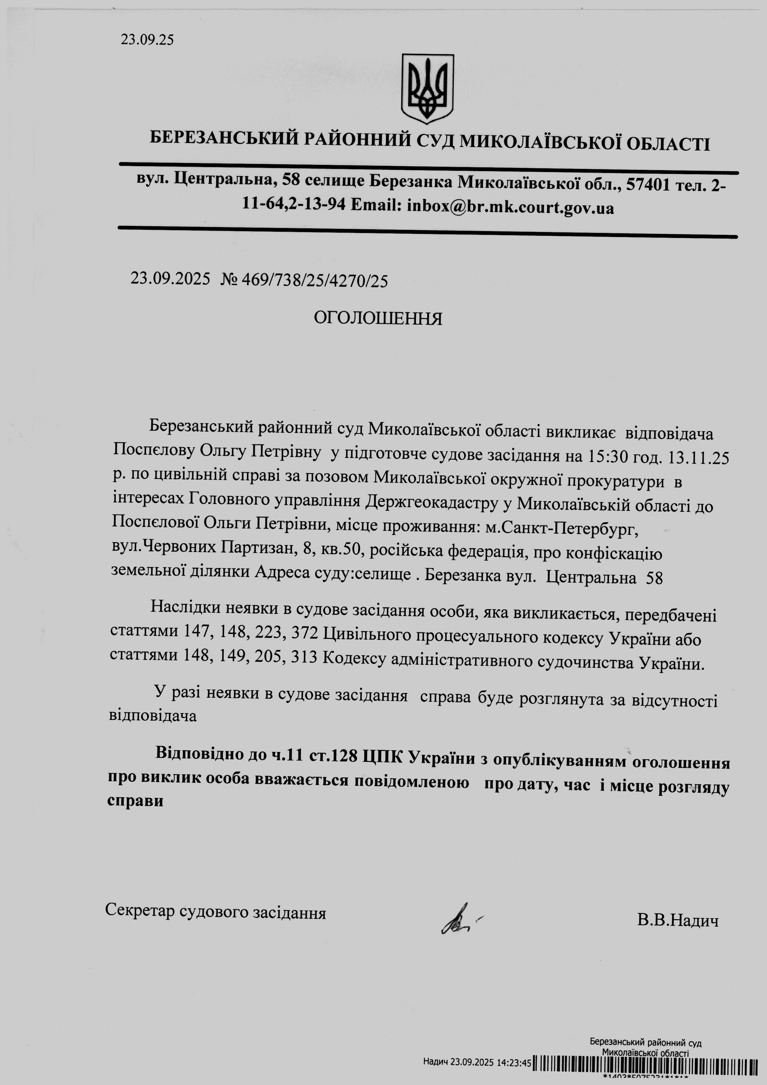 Виклик до суду Поспєлову О.П
