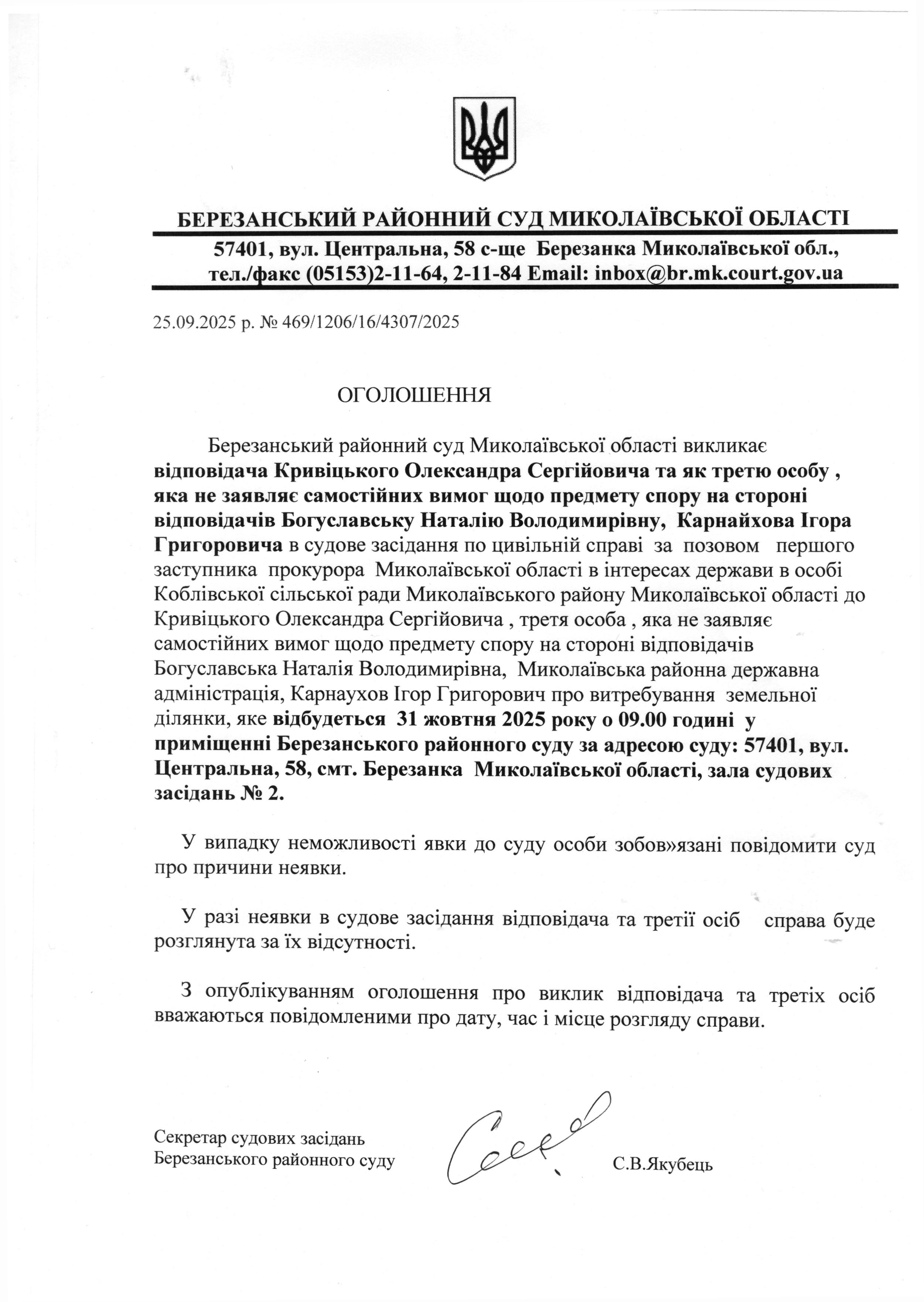 Виклик до суду Кривіцького та інших