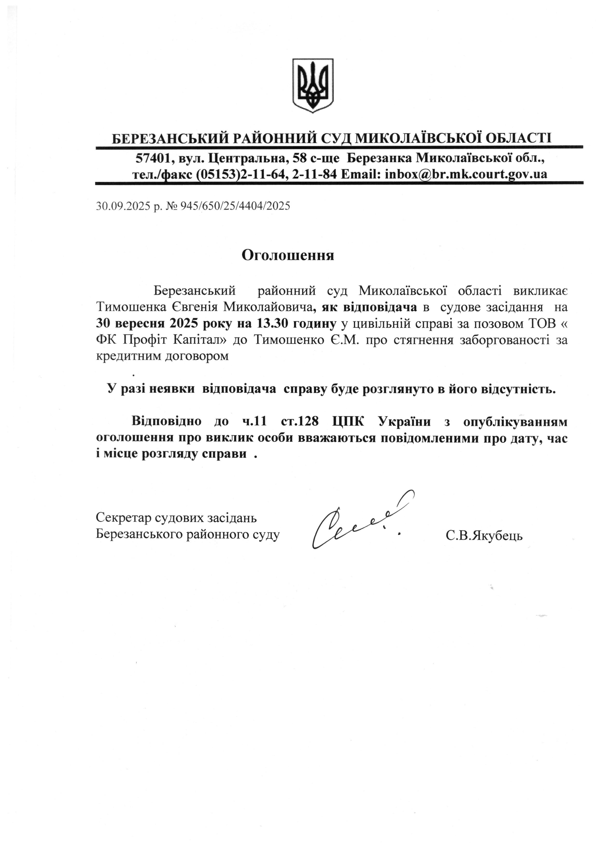 Виклик до суду Тимошенка Є.М.