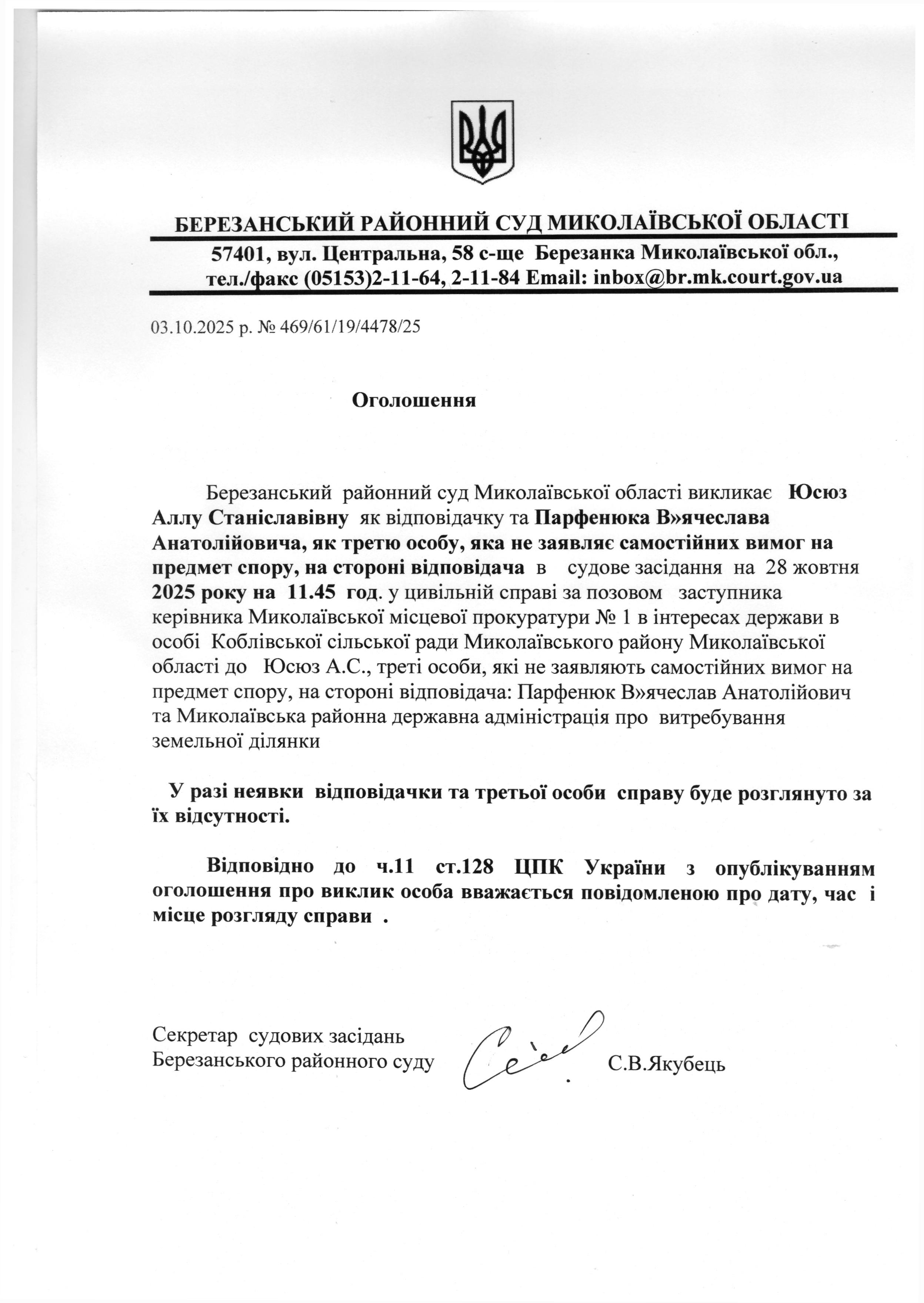 Виклик до суду Юсюз А.С.