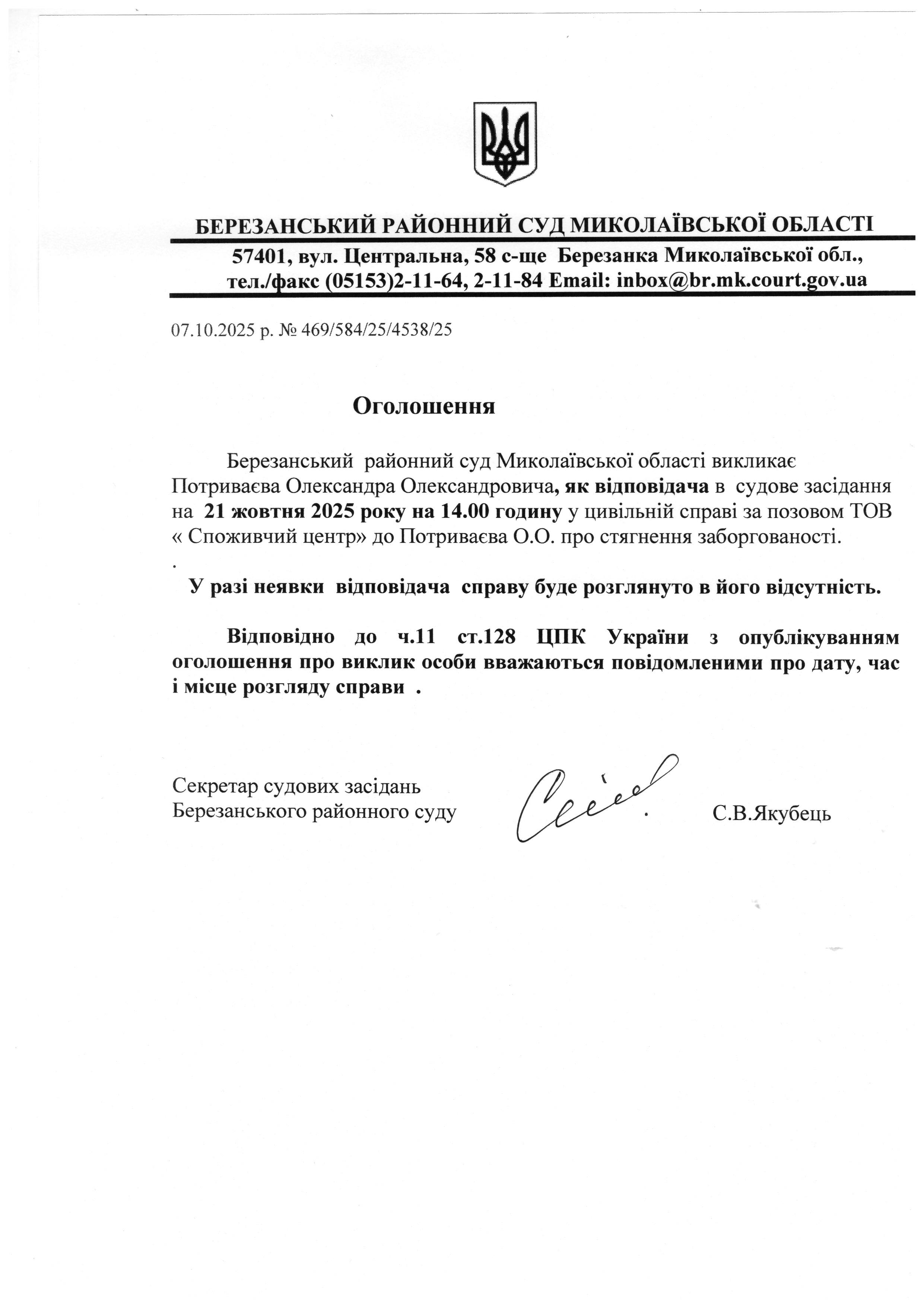 Виклик до суду Потриваєва О.О.