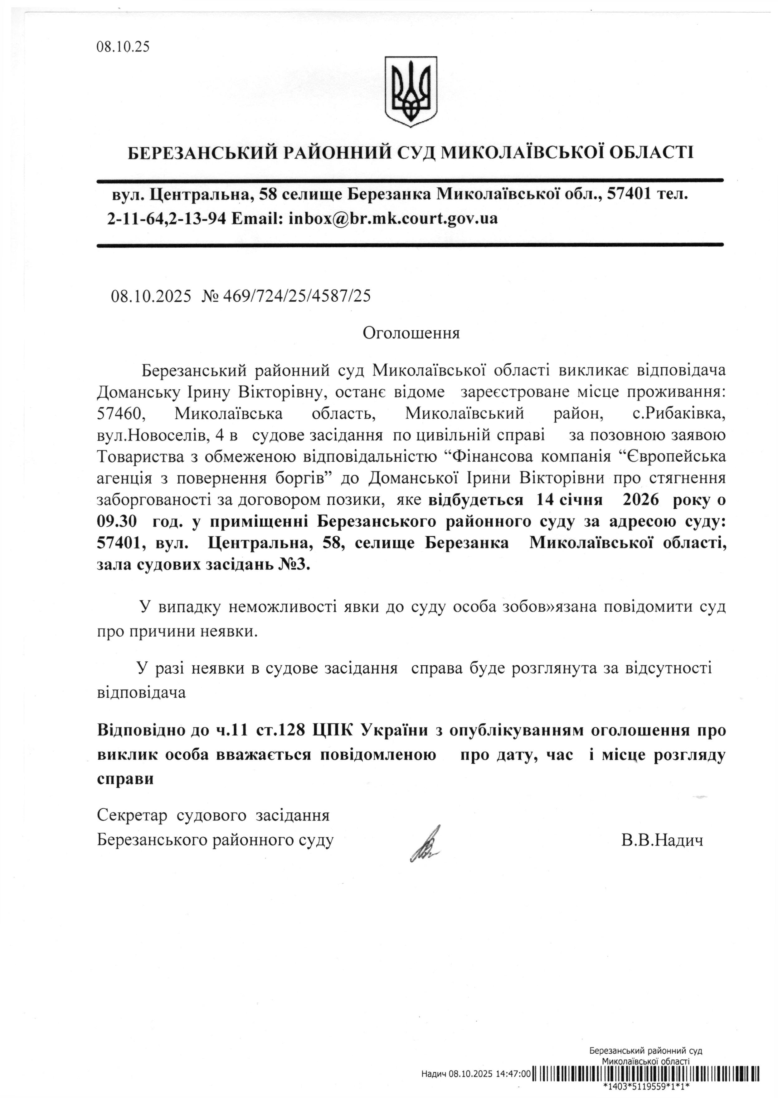 Виклик до суду Доманську І.В.