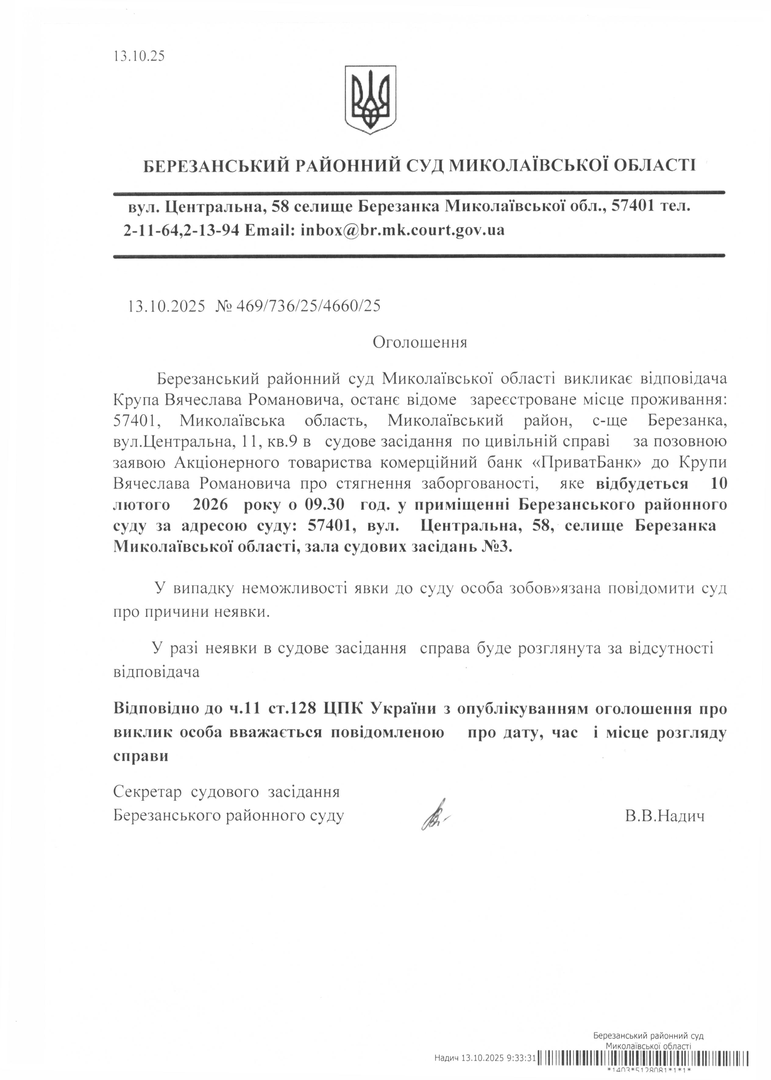 Виклик до суду Крупа В.Р.