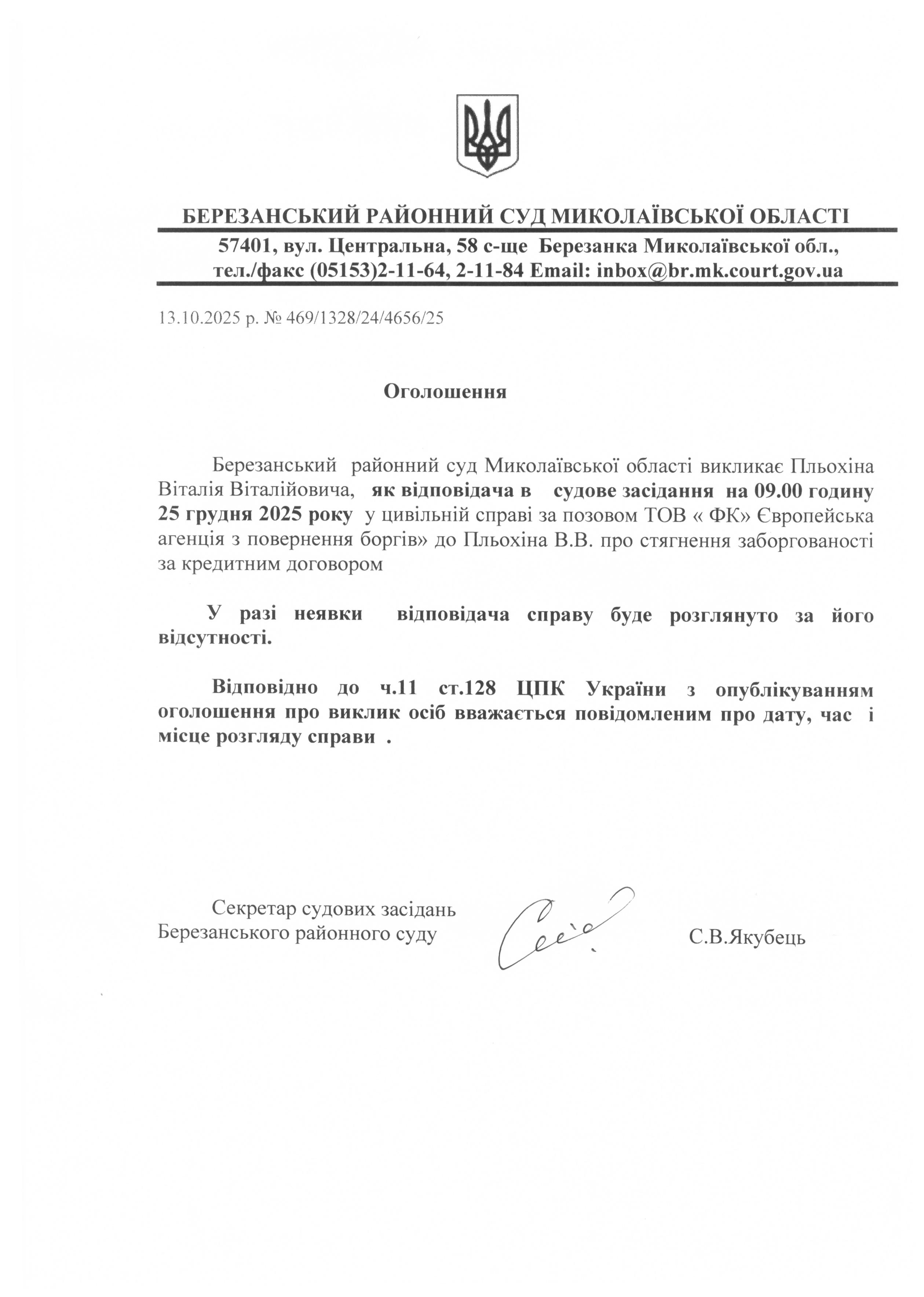 Виклик до суду Пльохіна В.В.