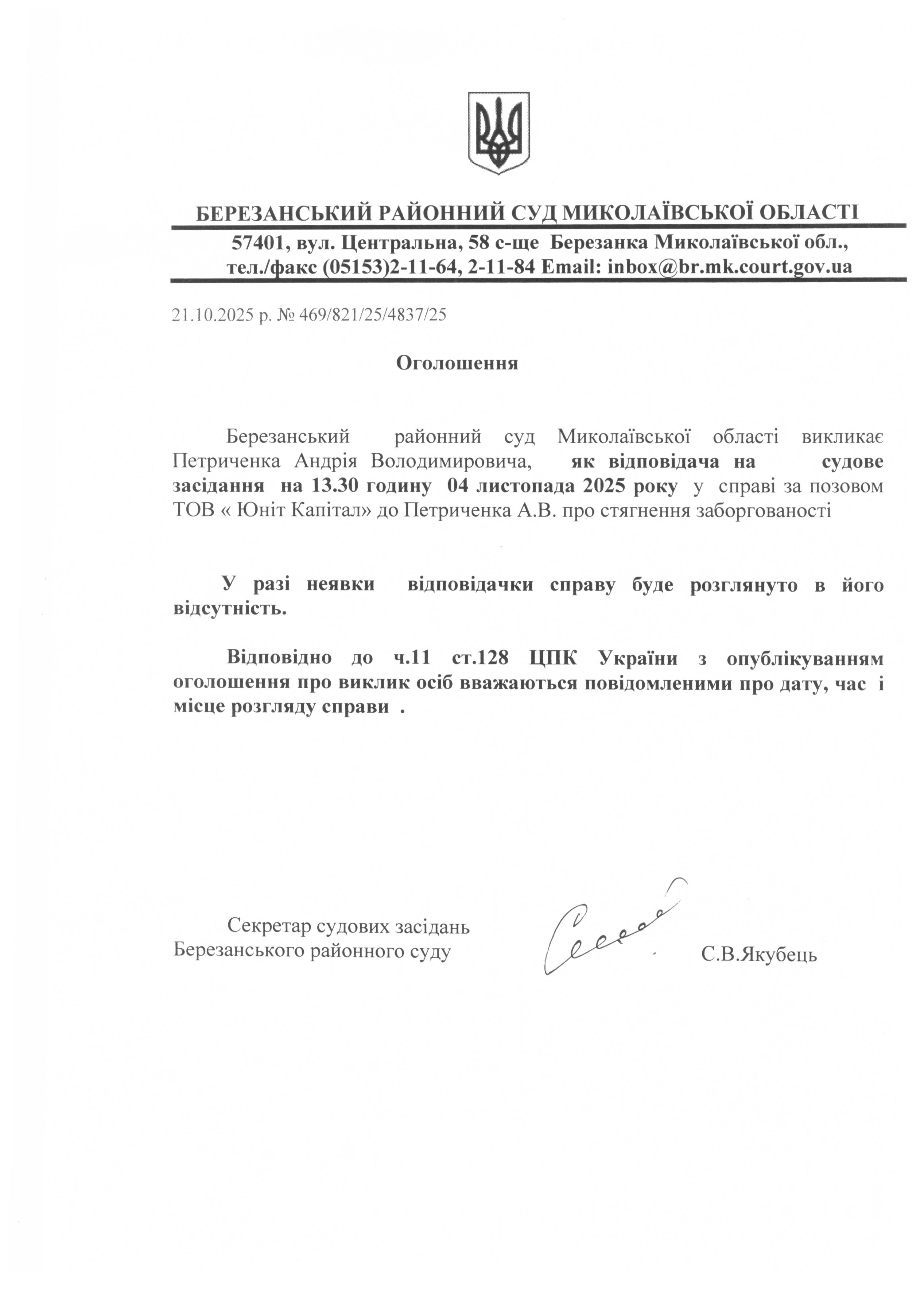 Виклик до суду Петриченка А.В.
