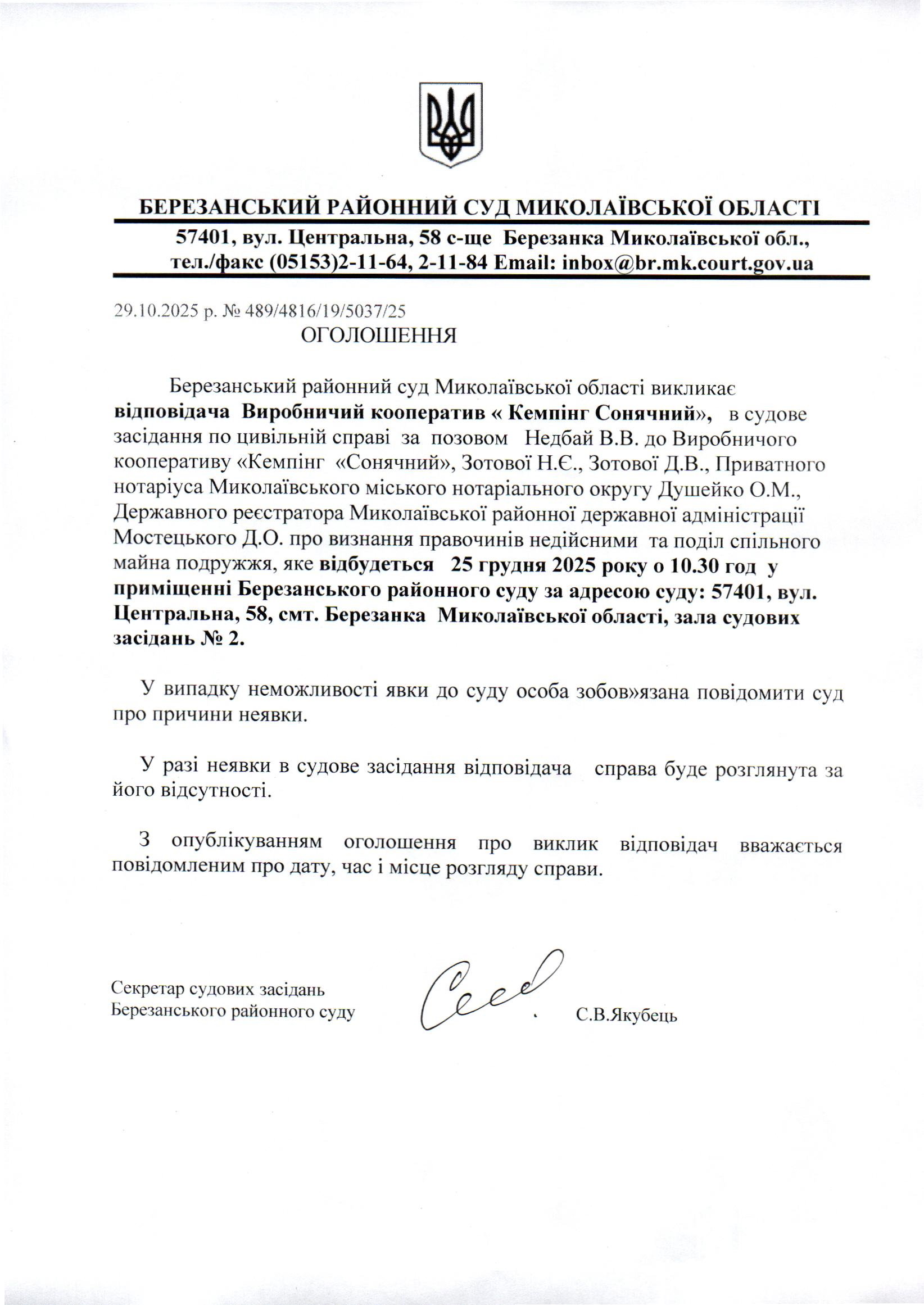 Виклик до суду Виробничий кооператив " Кемпінг Сонячний "