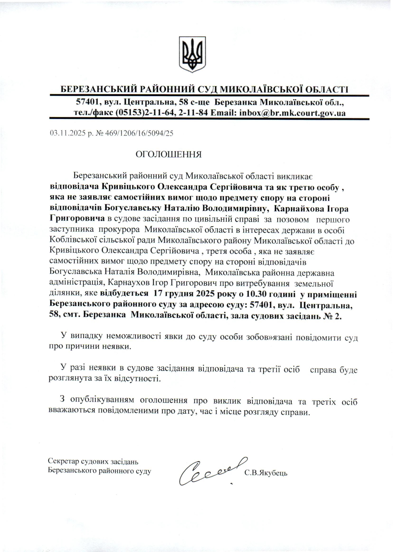 Виклик до суду Кривіцького О.С. та інших