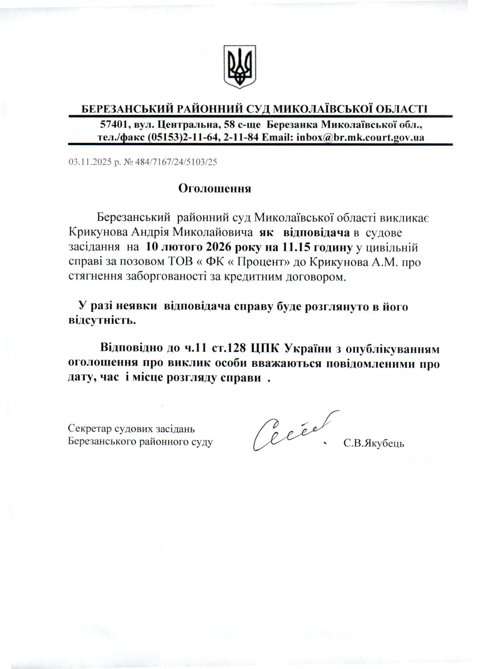 Виклик до суду Крикунова А.М.