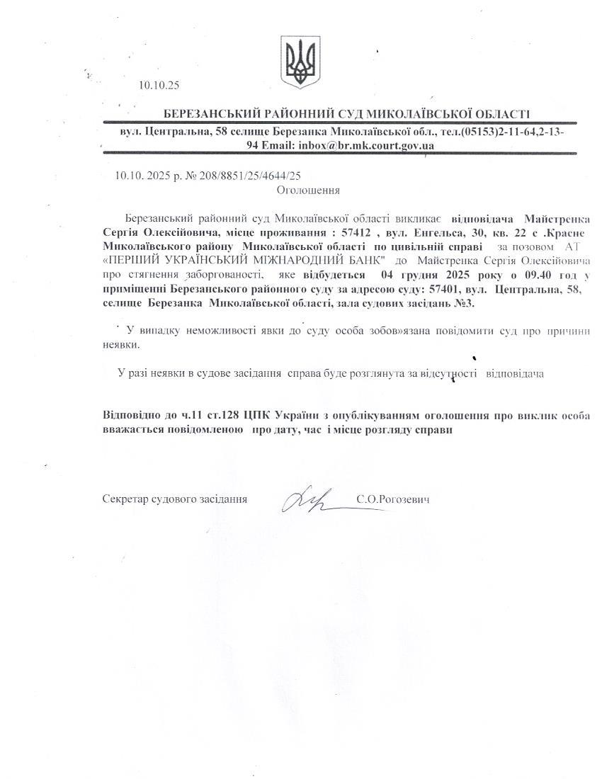 Виклик до суду Майстренка С.О.