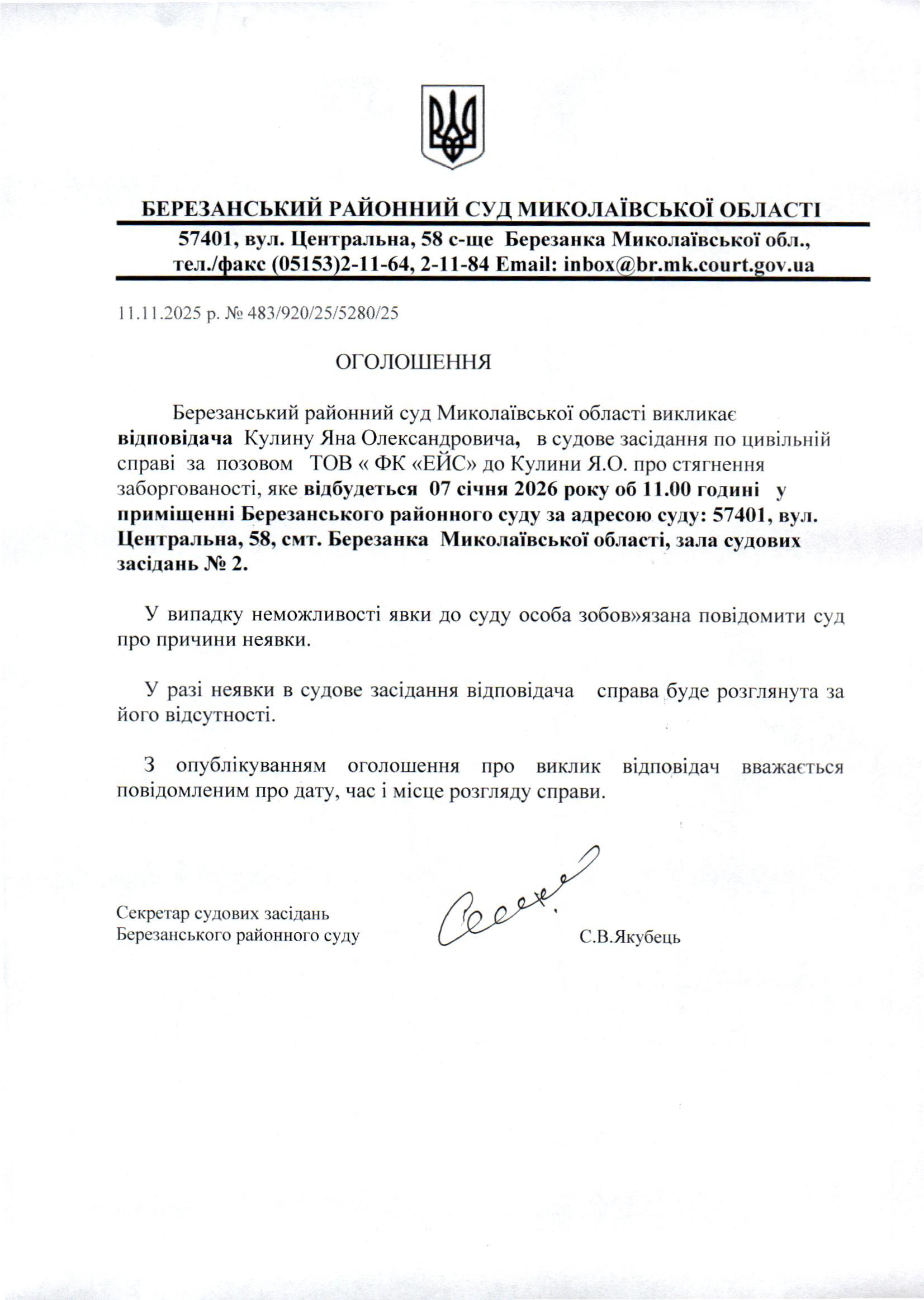 Виклик до суду Кулину Я.О.
