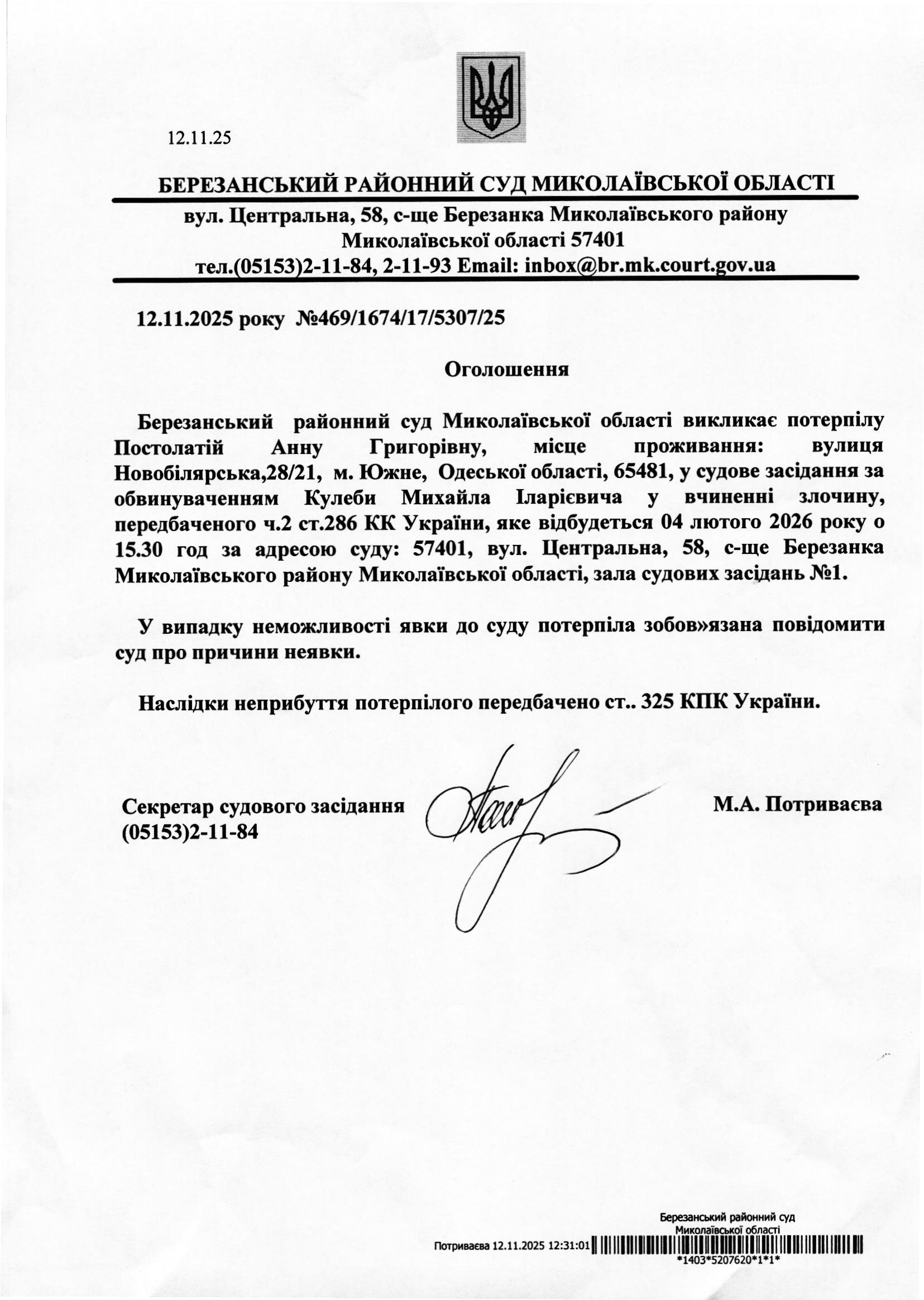 Виклик до суду Постолатій А.Г.