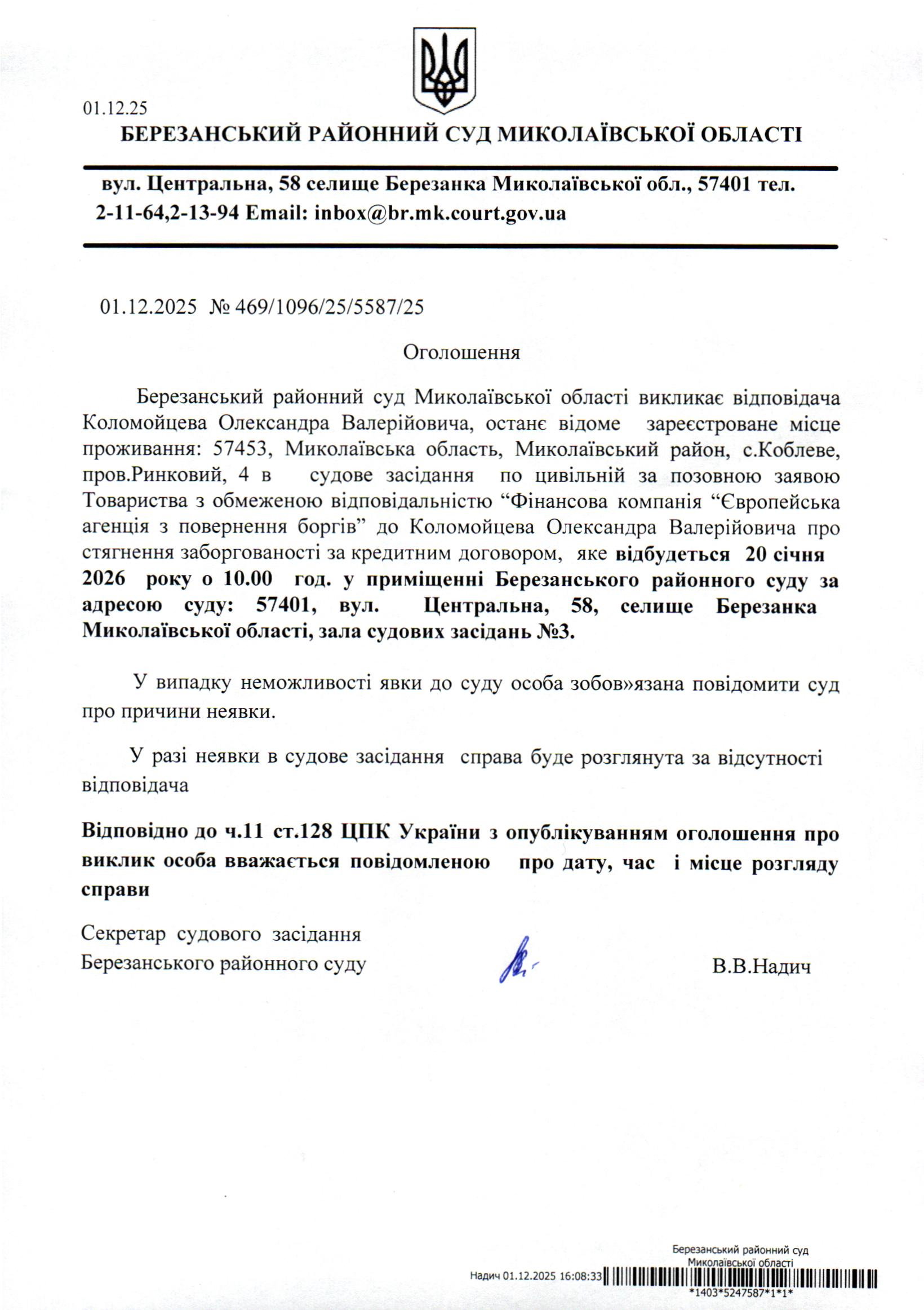 Виклик до суду Коломойцева О.В.