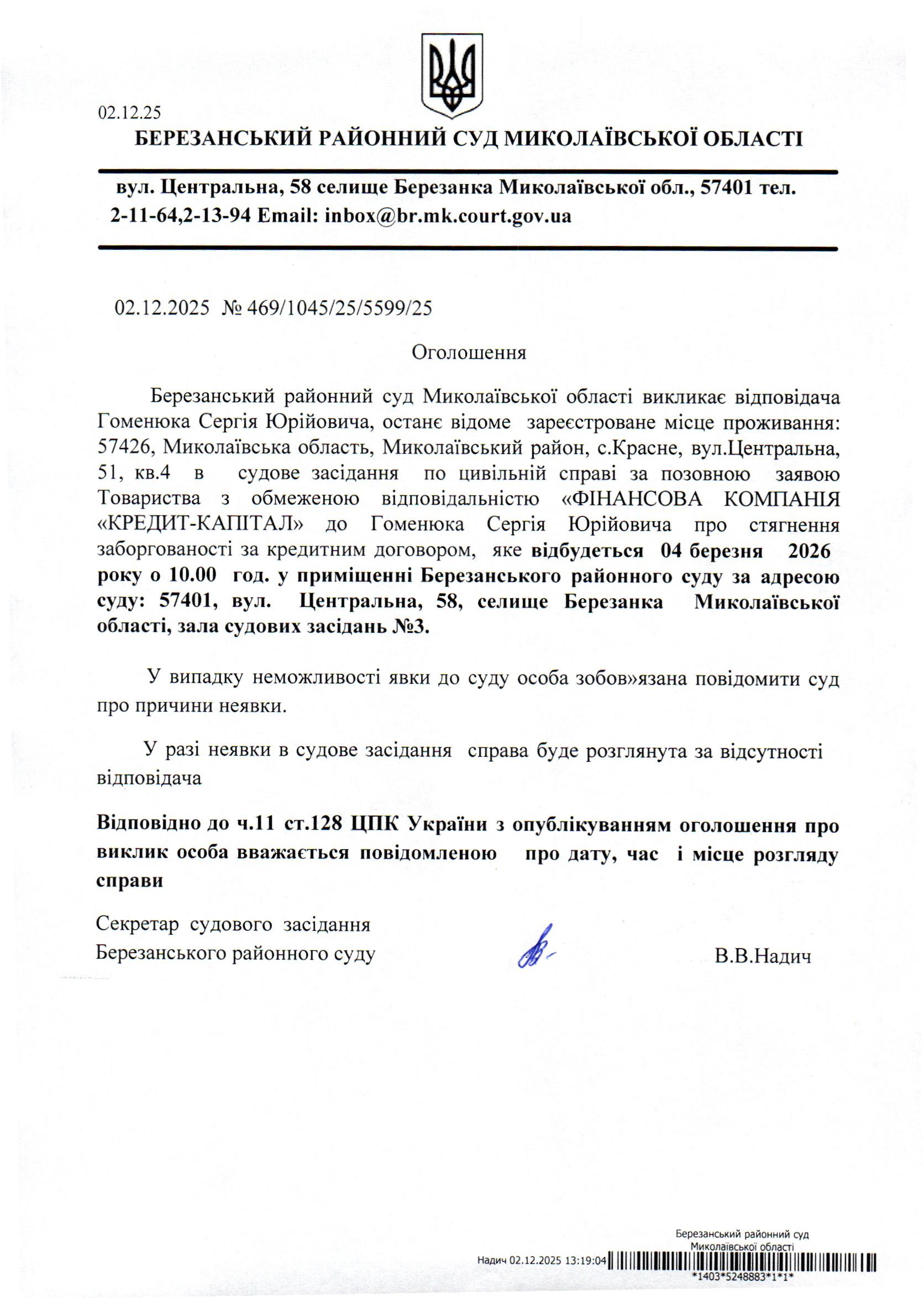 Виклик до суду Гоменюка С.Ю.
