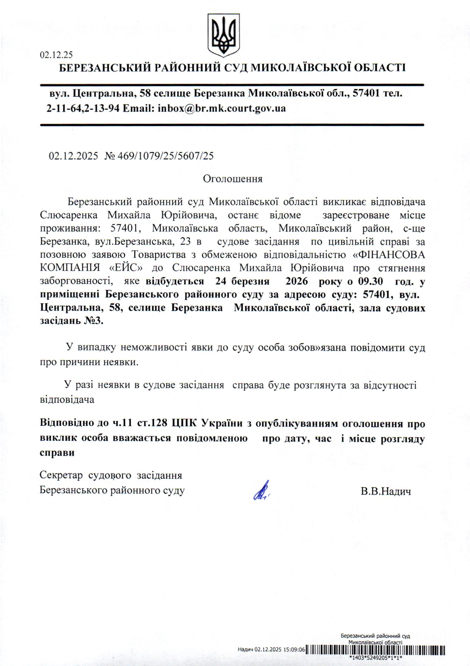 Виклик до суду Слюсаренка М.Ю.
