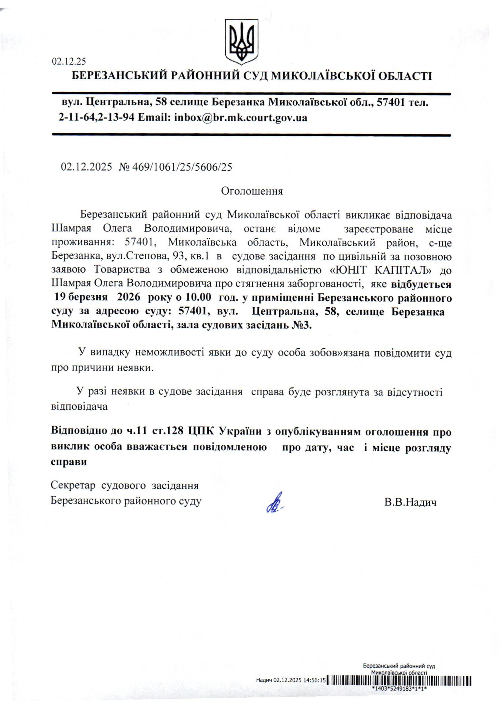 Виклик до суду Шамрая О.В.
