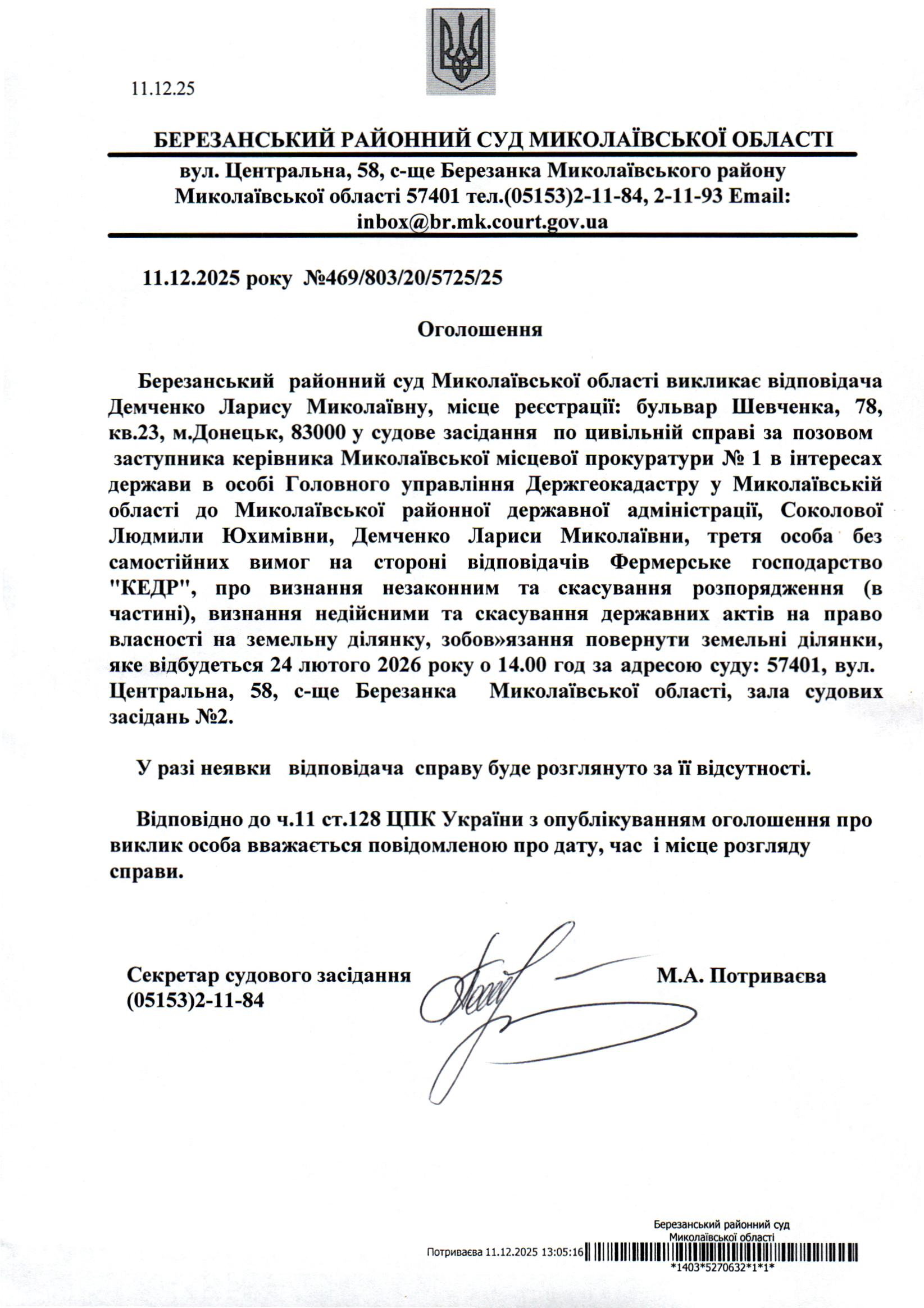 Виклик до суду Демченко Л.М.
