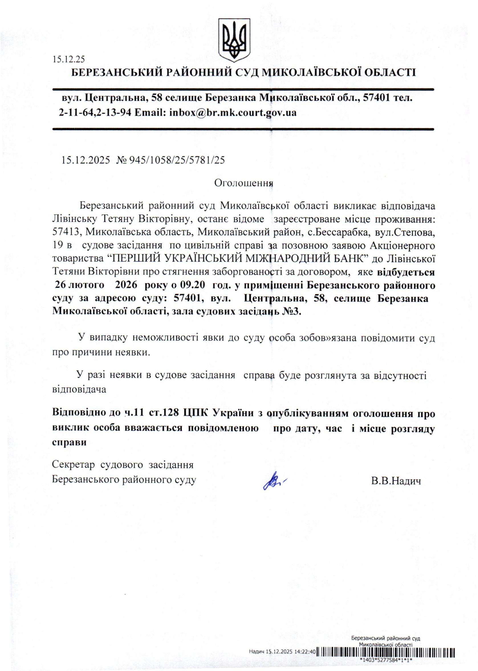 Виклик до суду Лівінську Т.В.