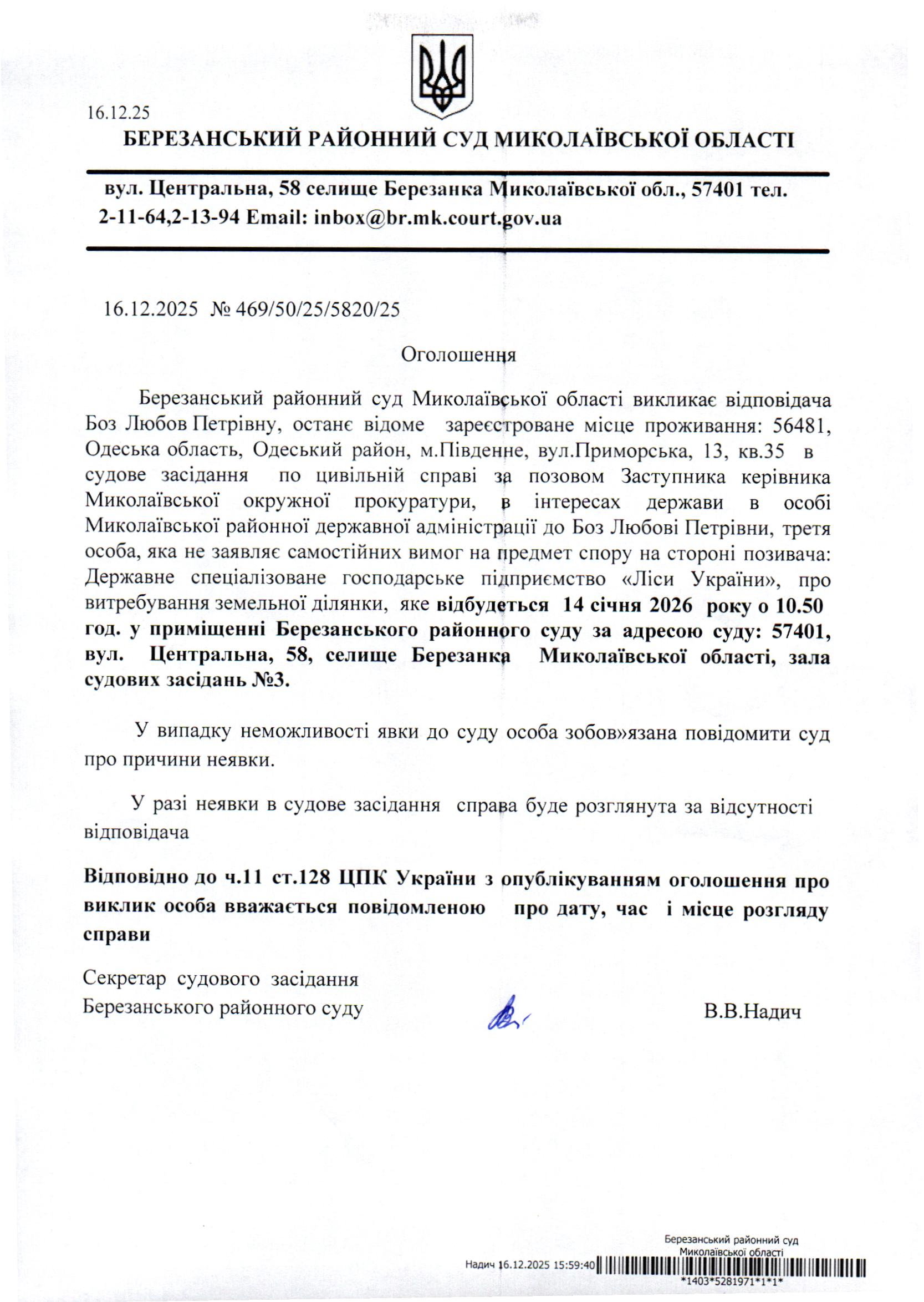 Виклик до суду Боз Л.П.