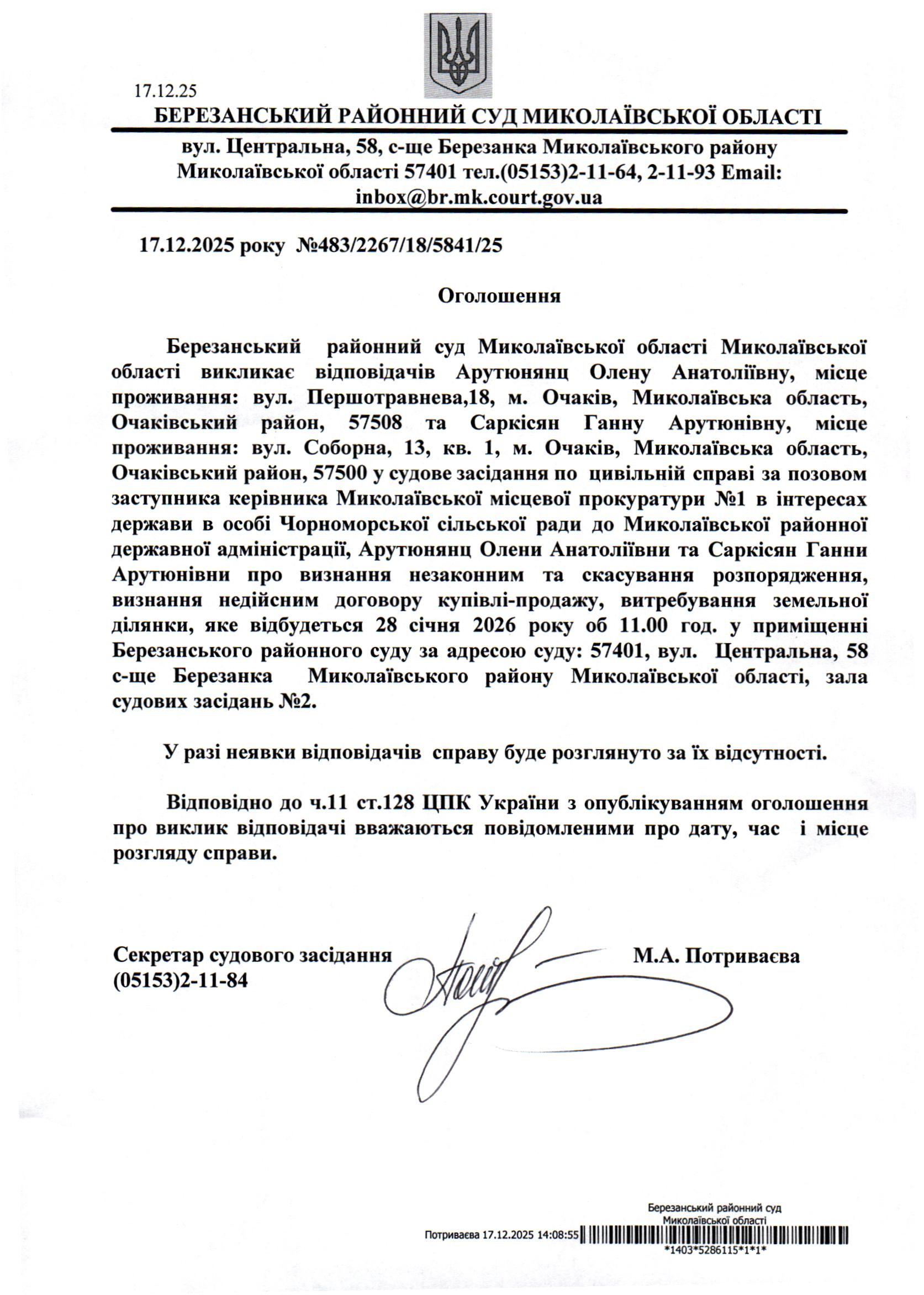 Виклик до суду Арутюнянц О.А. та Саркисян Г.А.