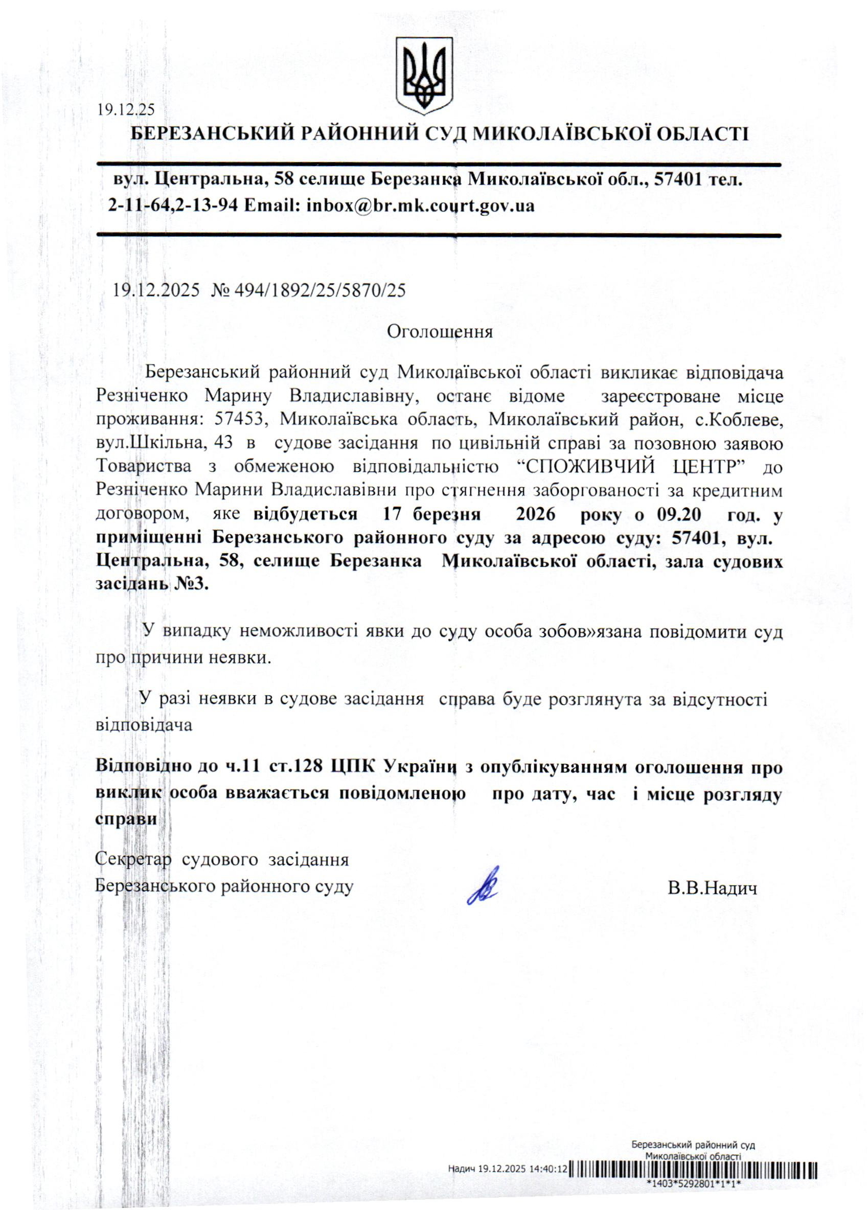 Виклик до суду Резніченко М.В.
