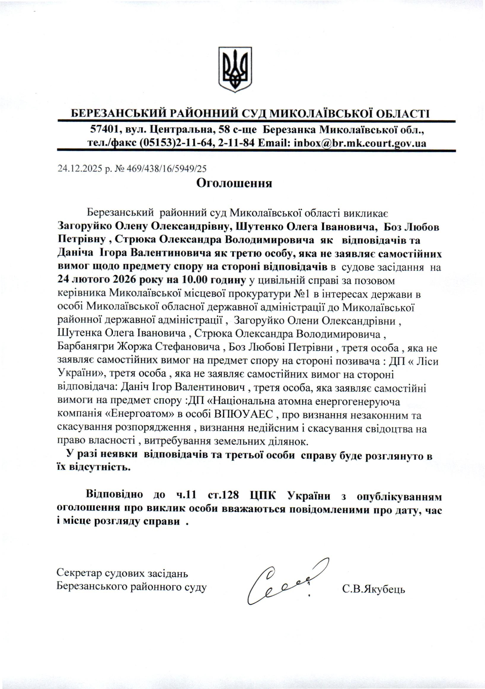 Виклик до суду Загоруйко О.О., Шутенко О.І., Боз Л.П., Стрюка О.В., та Даніча І.В.