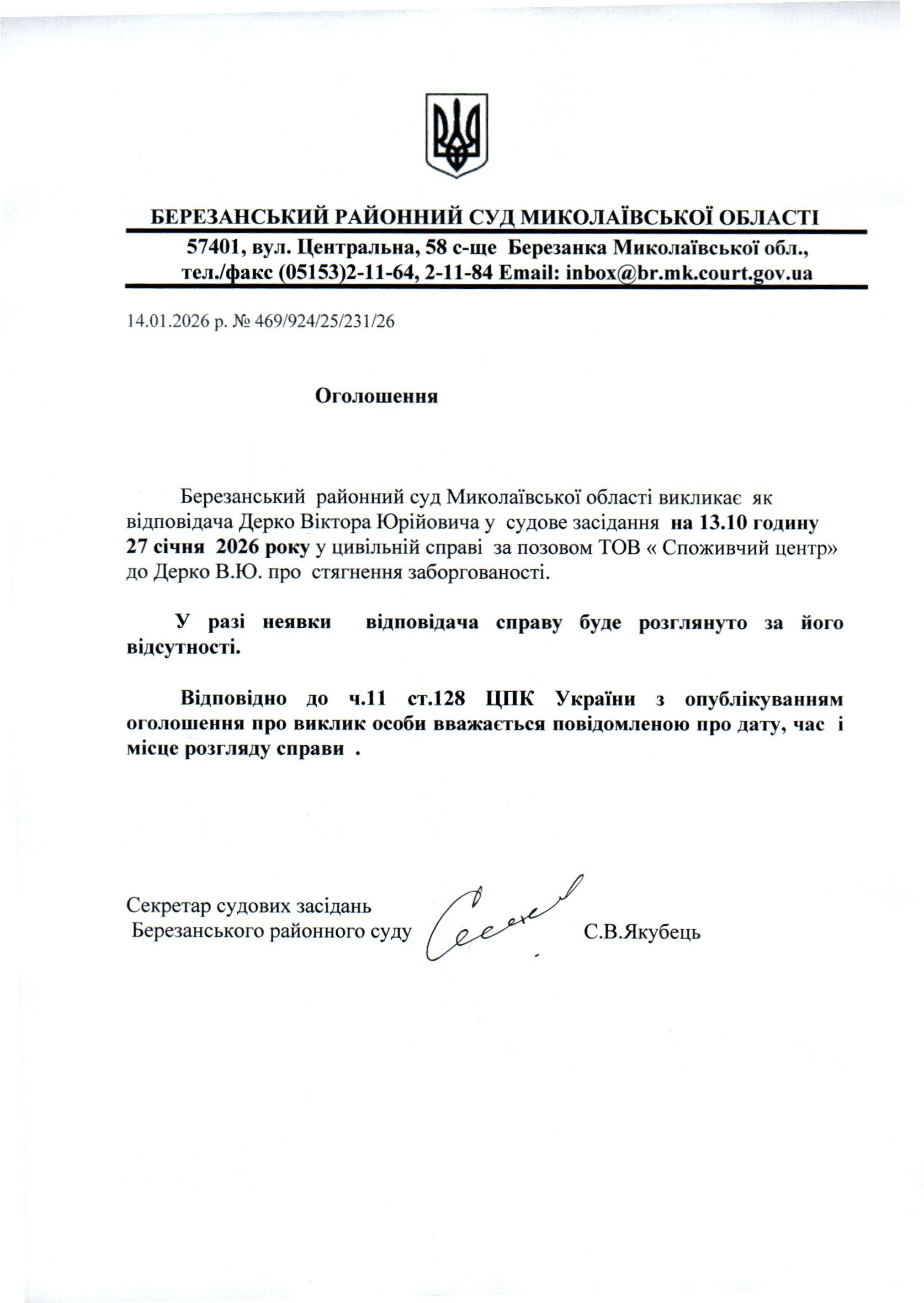 Виклик до суду Дерко В.Ю.