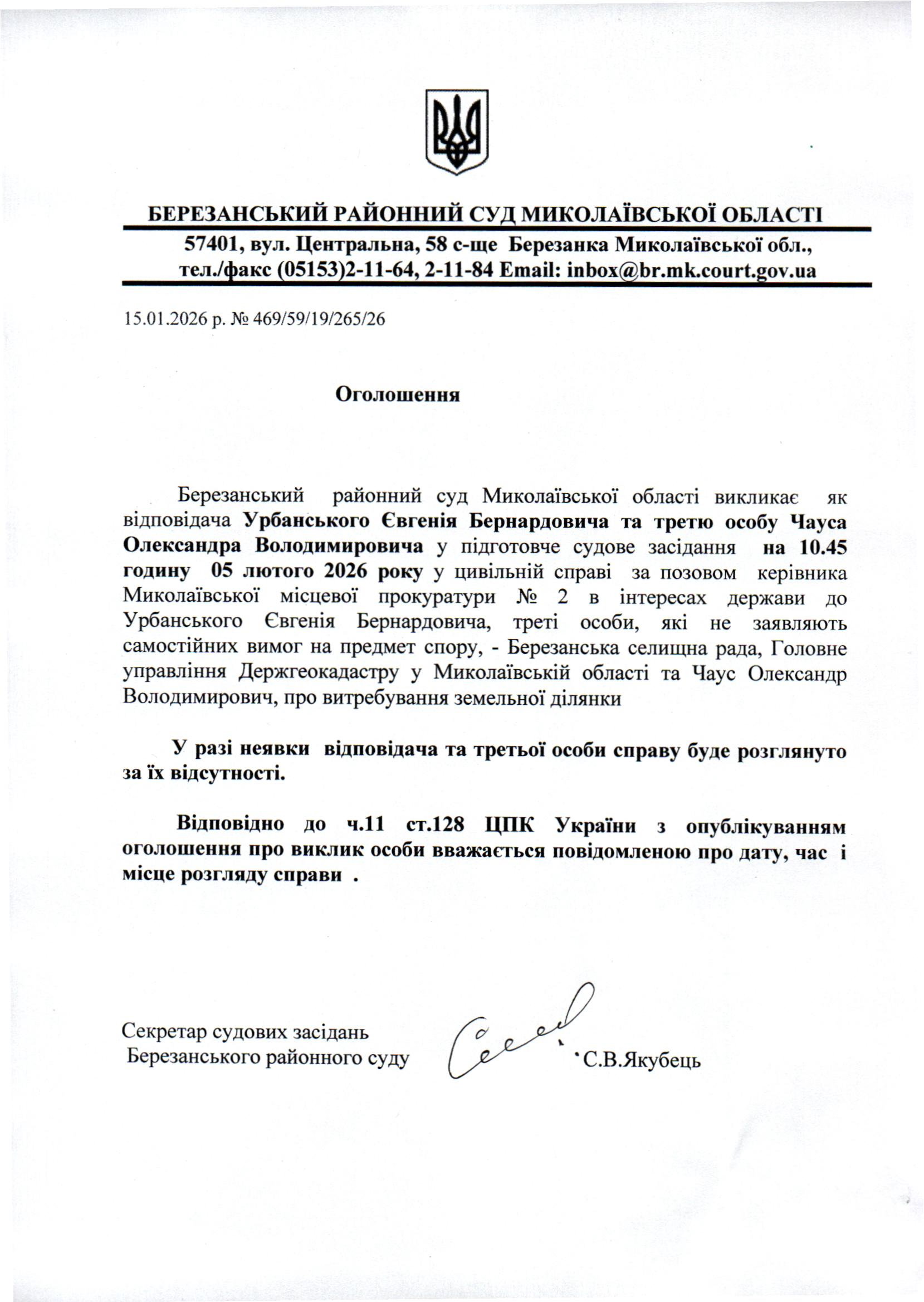 Виклик до суду Урбанського Є.Б. та Чауса О.В.