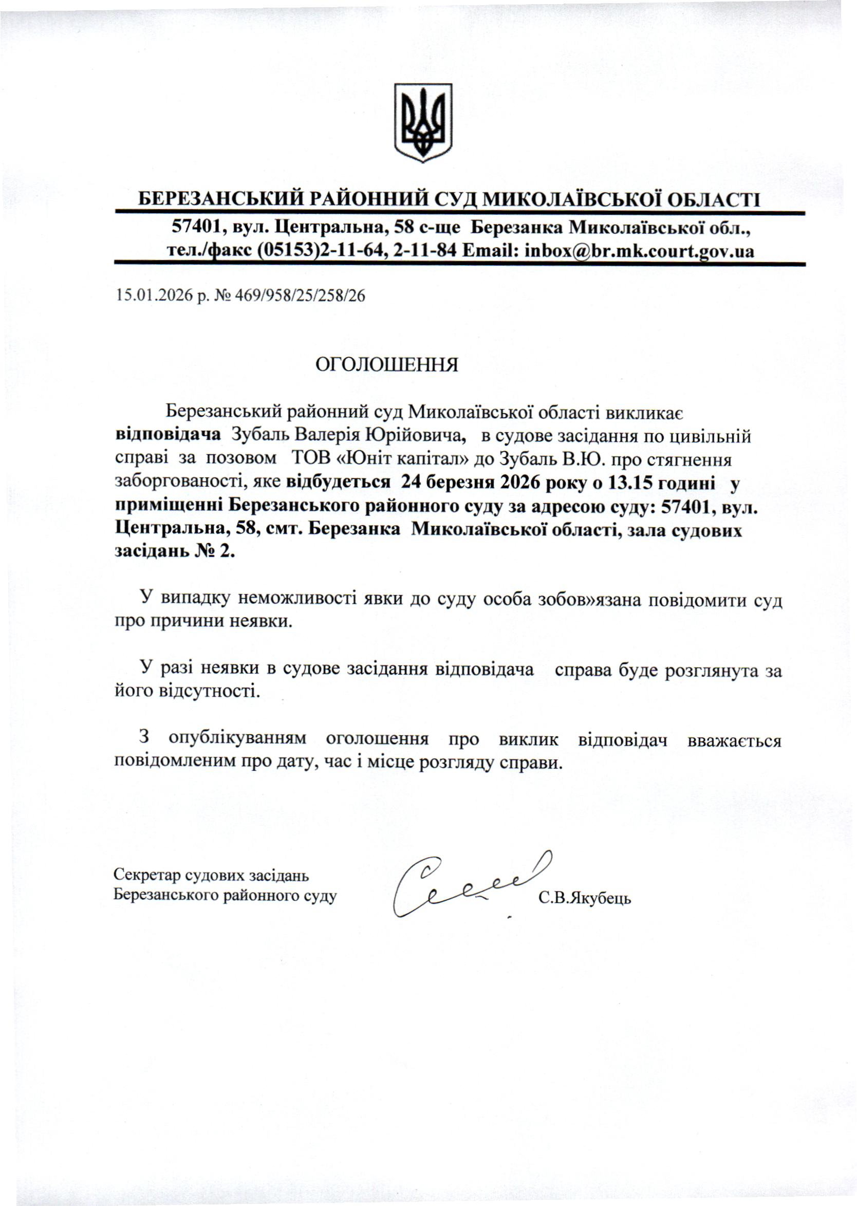 Виклик до суду Зубаль В.Ю.