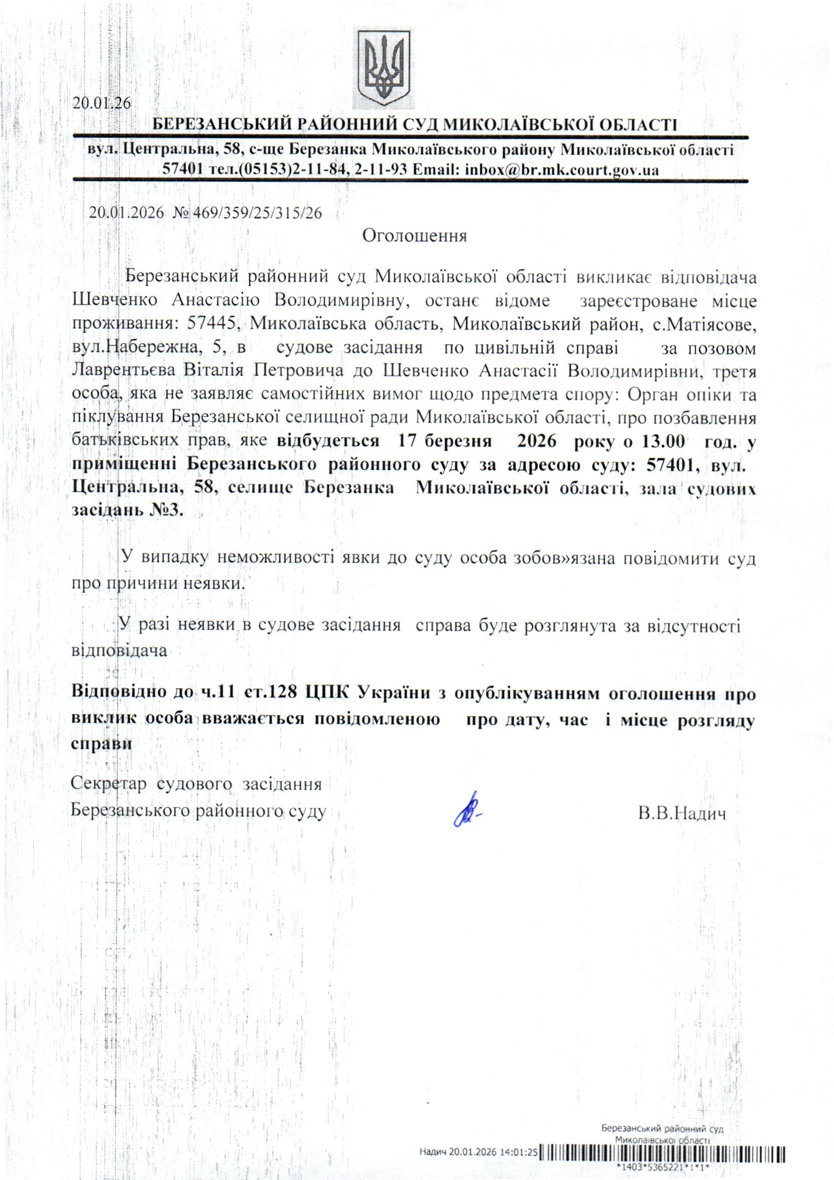 Виклик до суду Шевченко А.В.