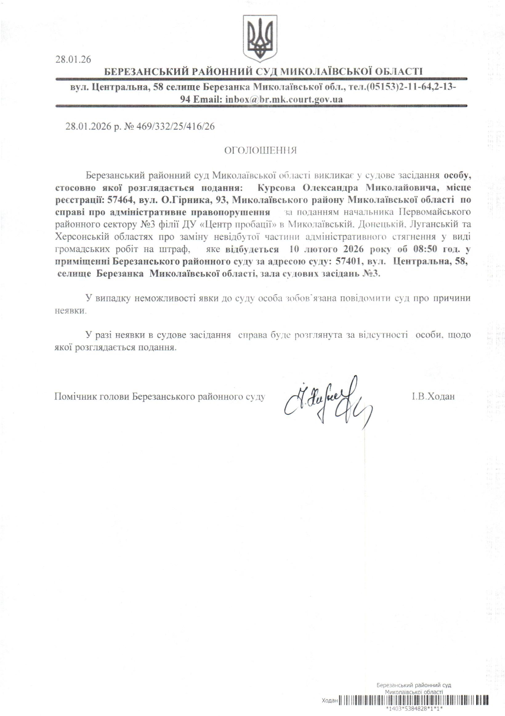 Виклик до суду Курсова О.М.