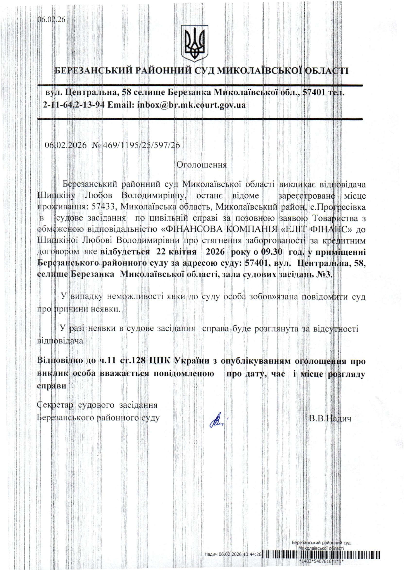 Виклик до суду Шишкіну Л.В.