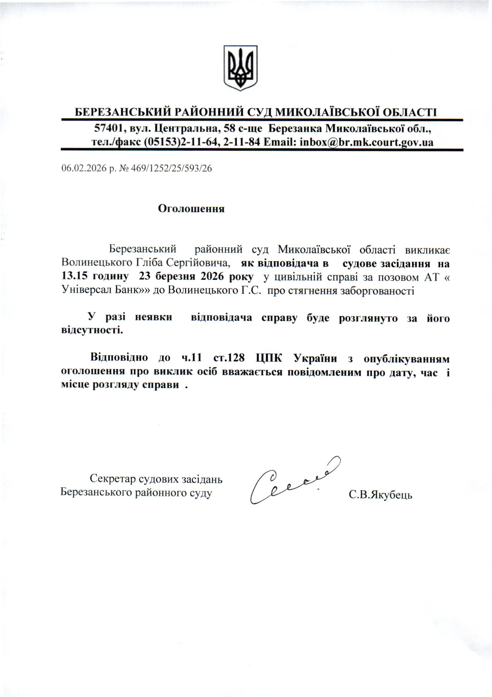 Виклик до суду Волинецького Г.С.