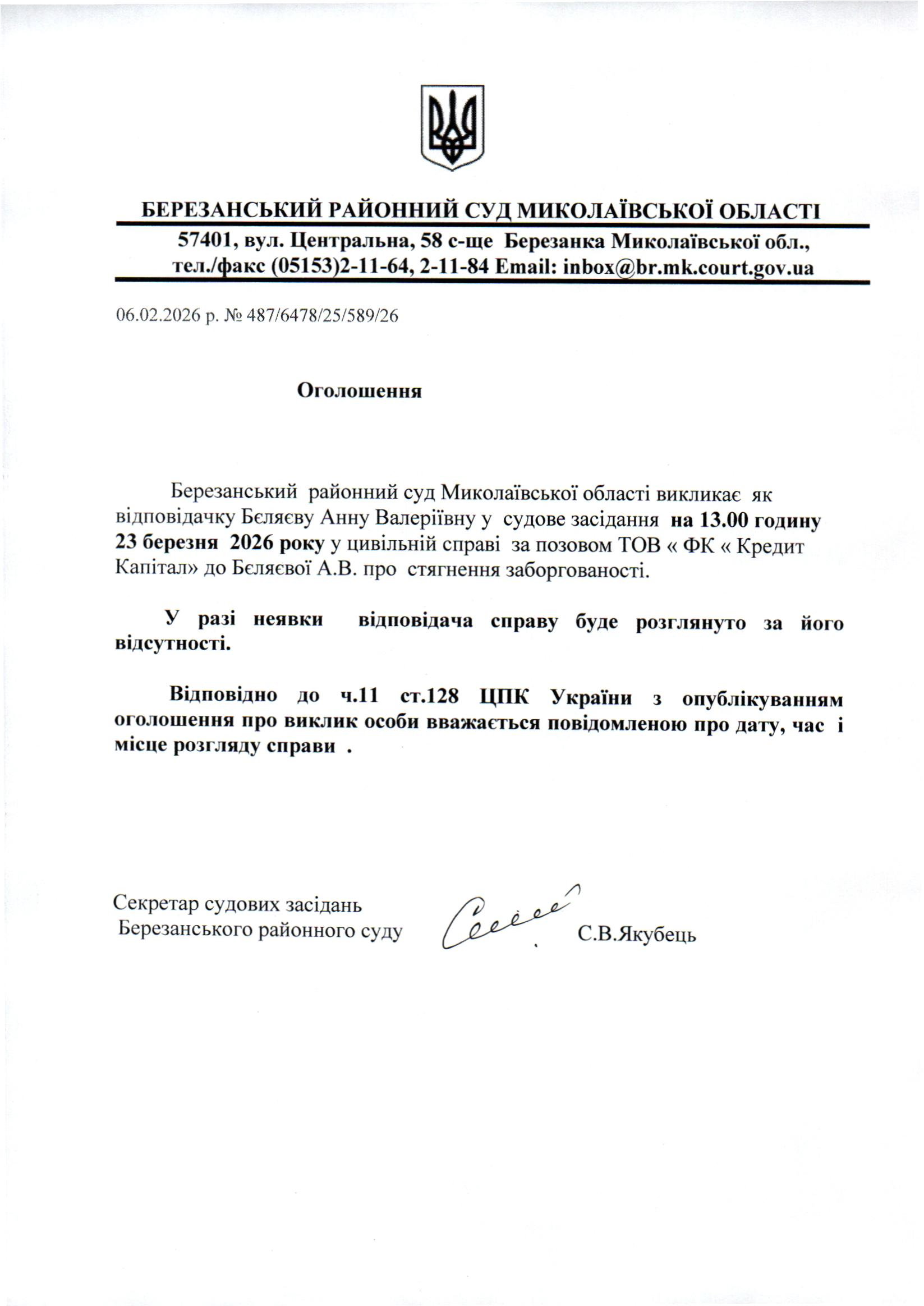 Виклик до суду Бєляєву А.В.