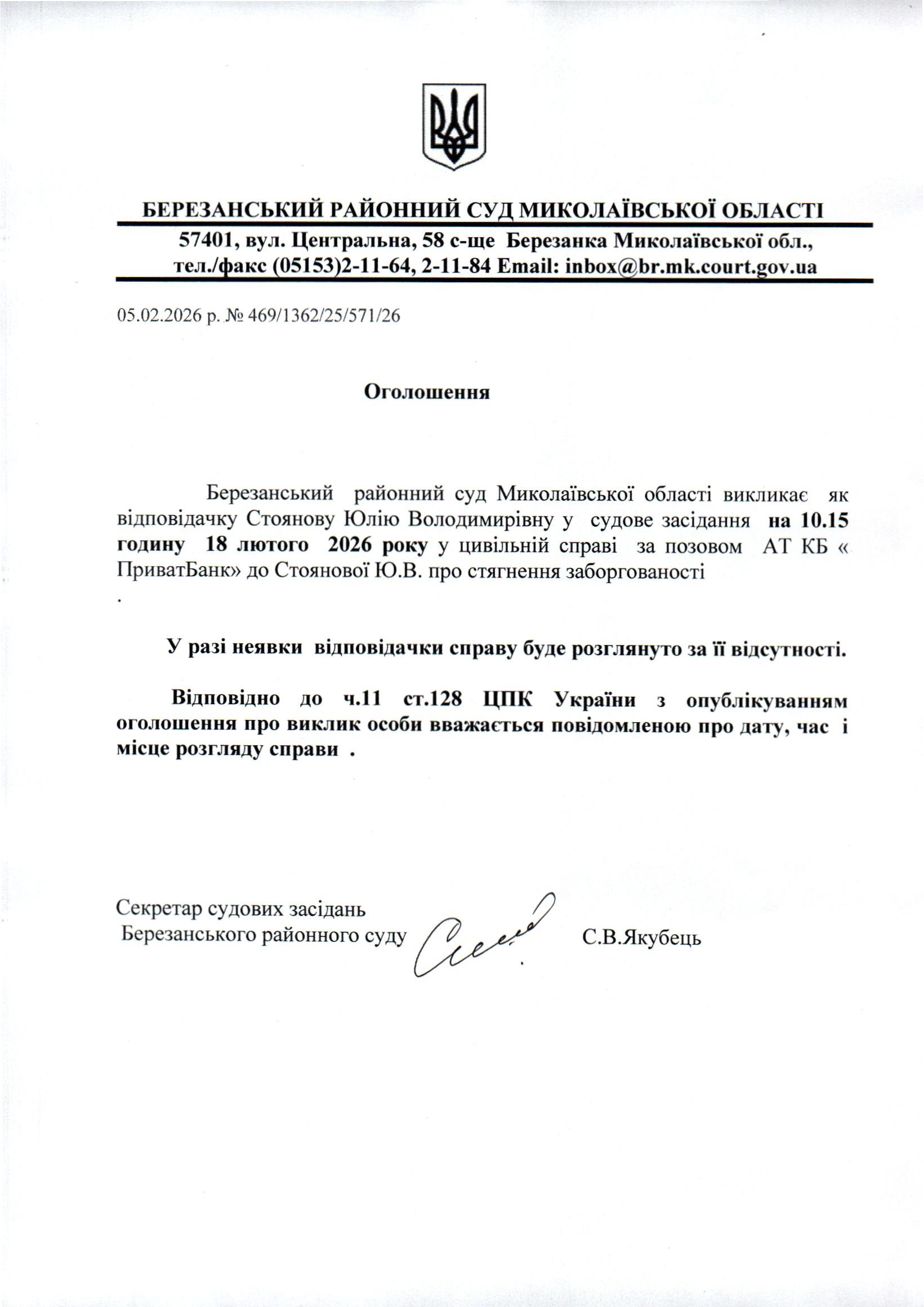 Виклик до суду Стоянову Ю.В.