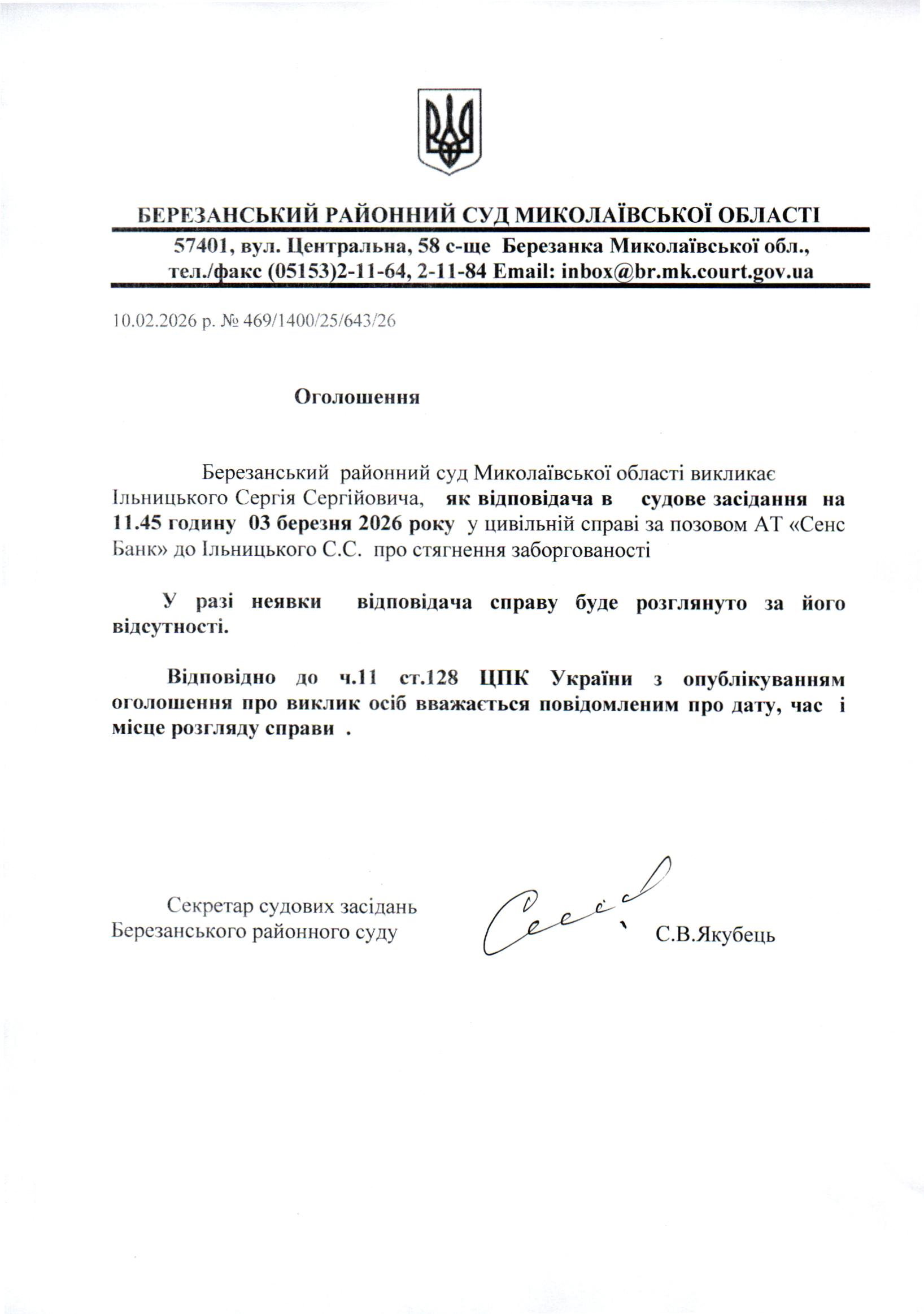Виклик до суду Ільницького С.С.
