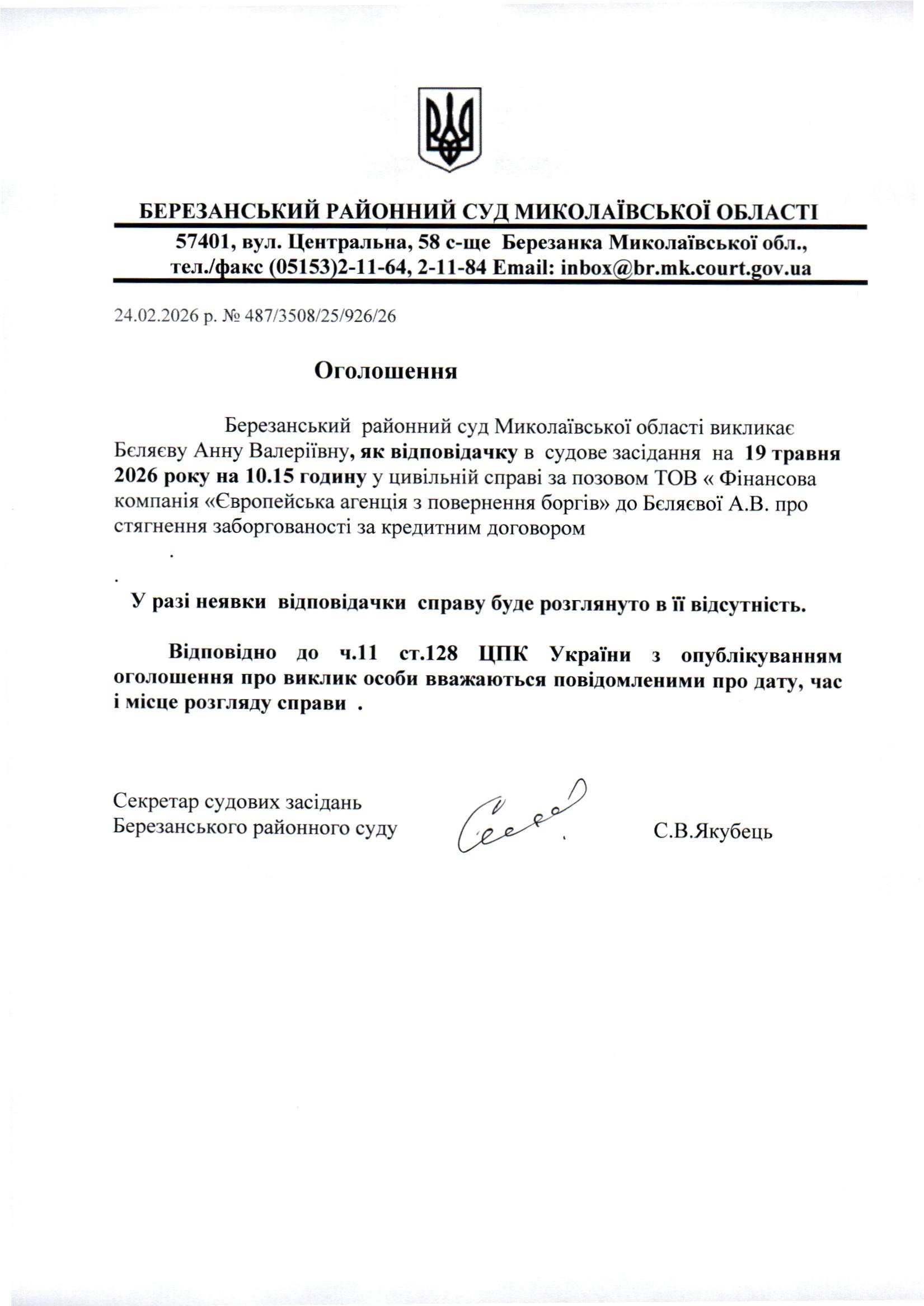 Виклик до суду Бєляєву А.В.