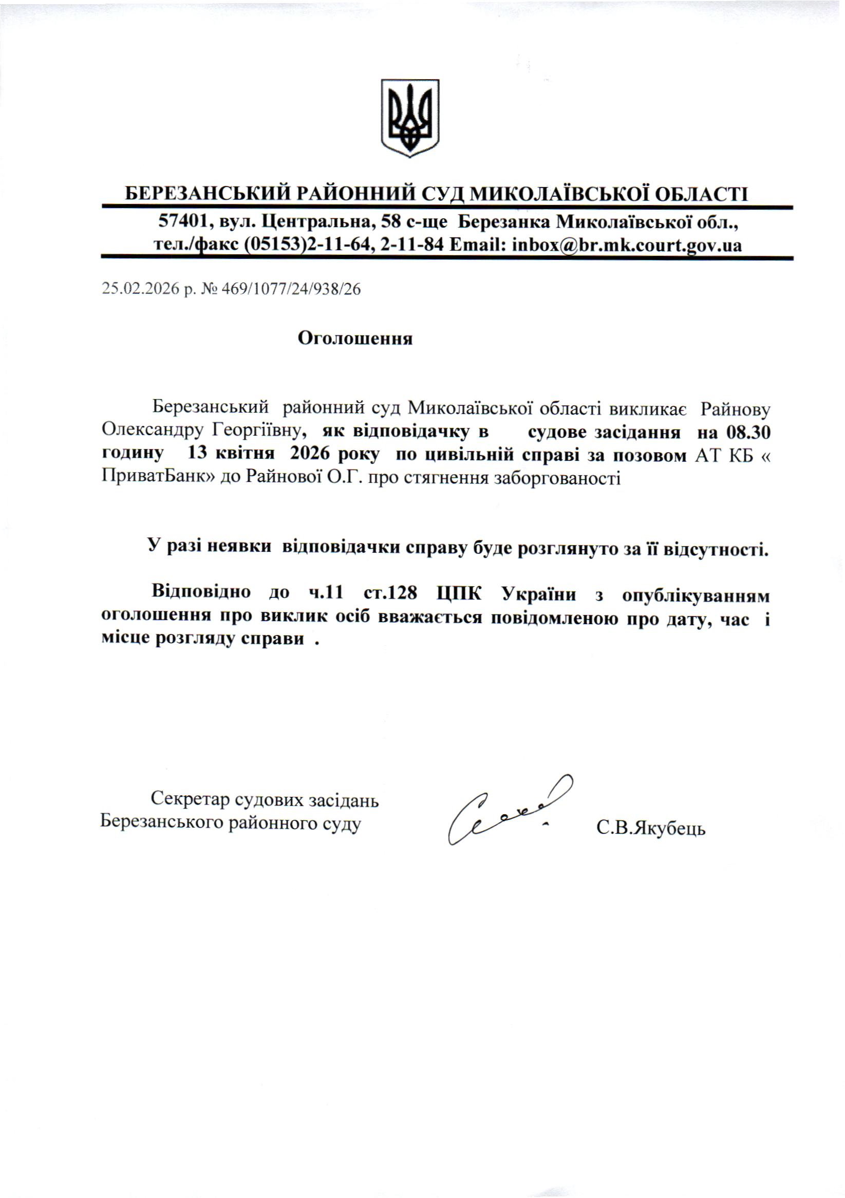 Виклик до суду Райнову О.Г.