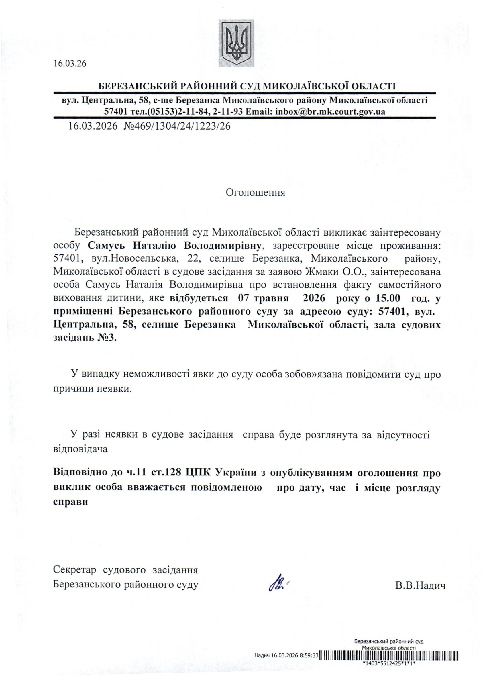 Виклик до суду Самусь Н.В.