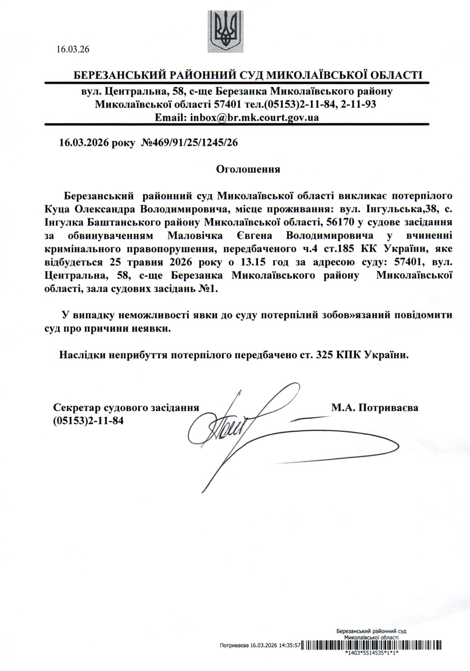 Виклик до суду Куца О.В.