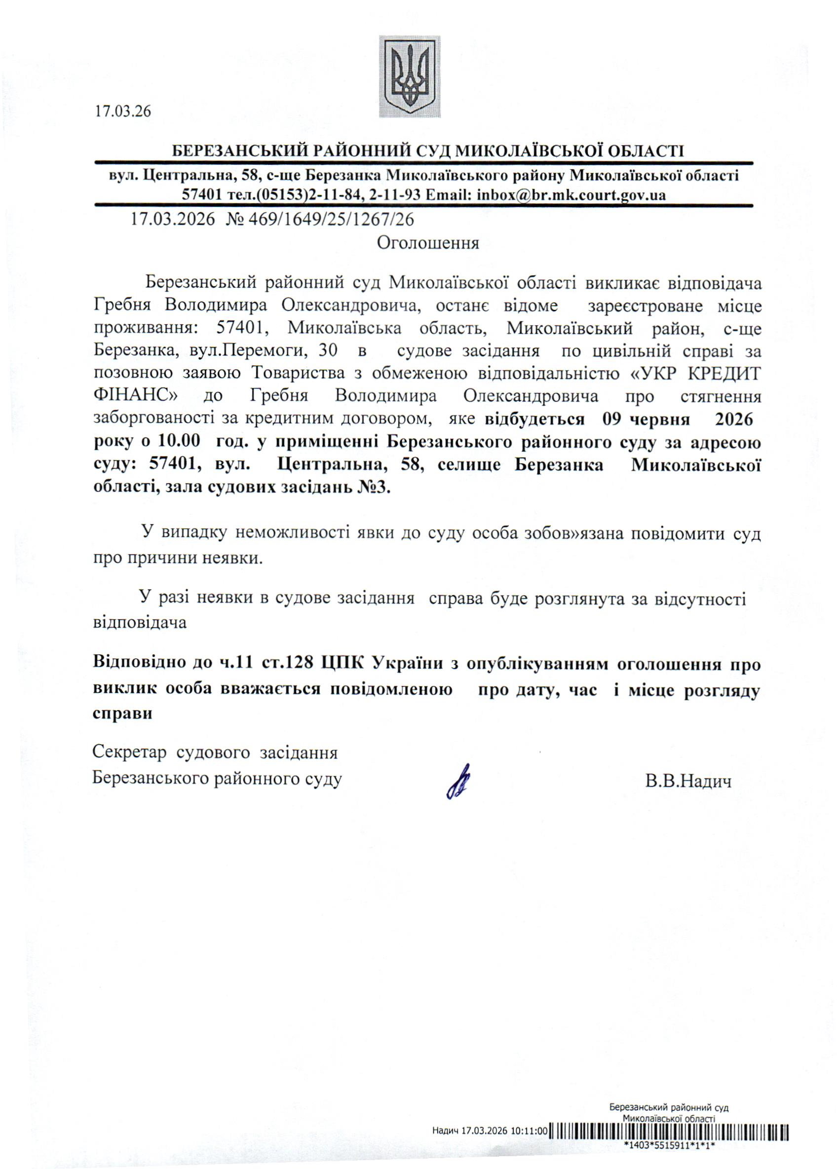 Виклик до суду Гребня В.О.