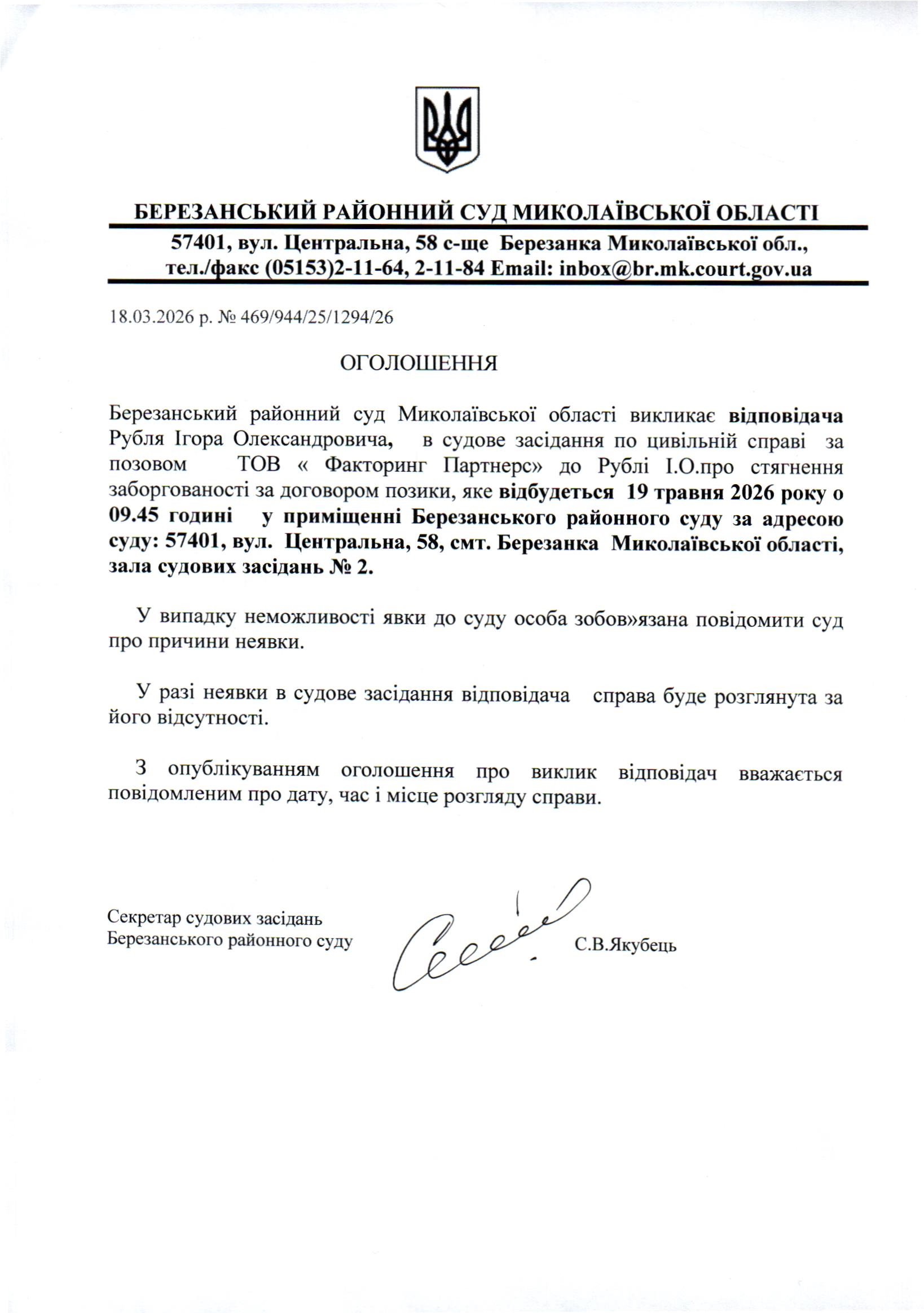 Виклик до суду Рубля І.О.
