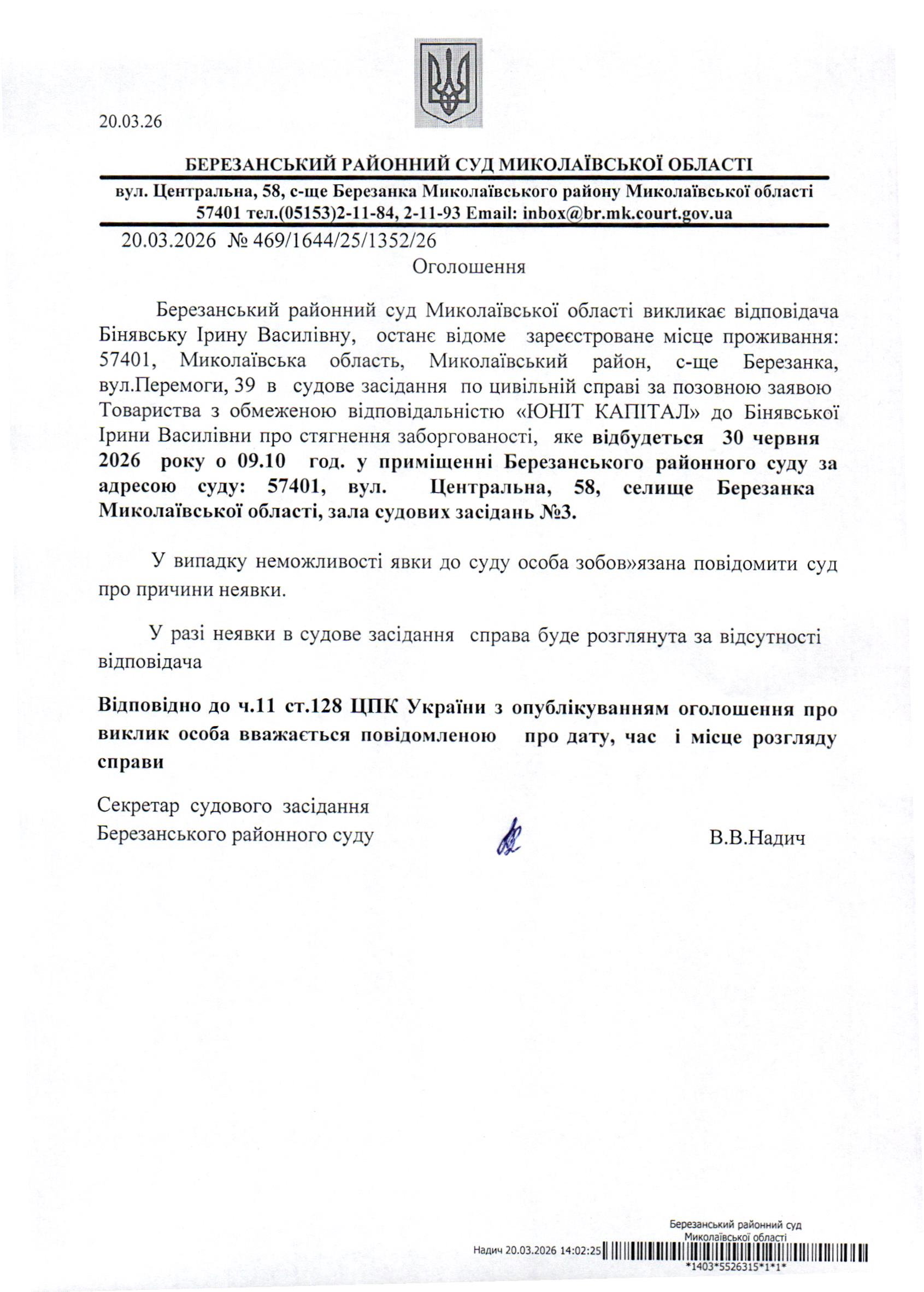 Виклик до суду Бінявську І.В.