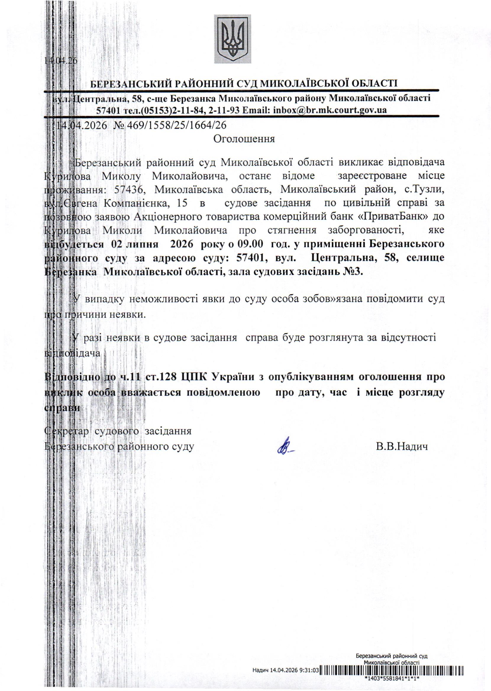 Виклик до суду Курилова М.М.
