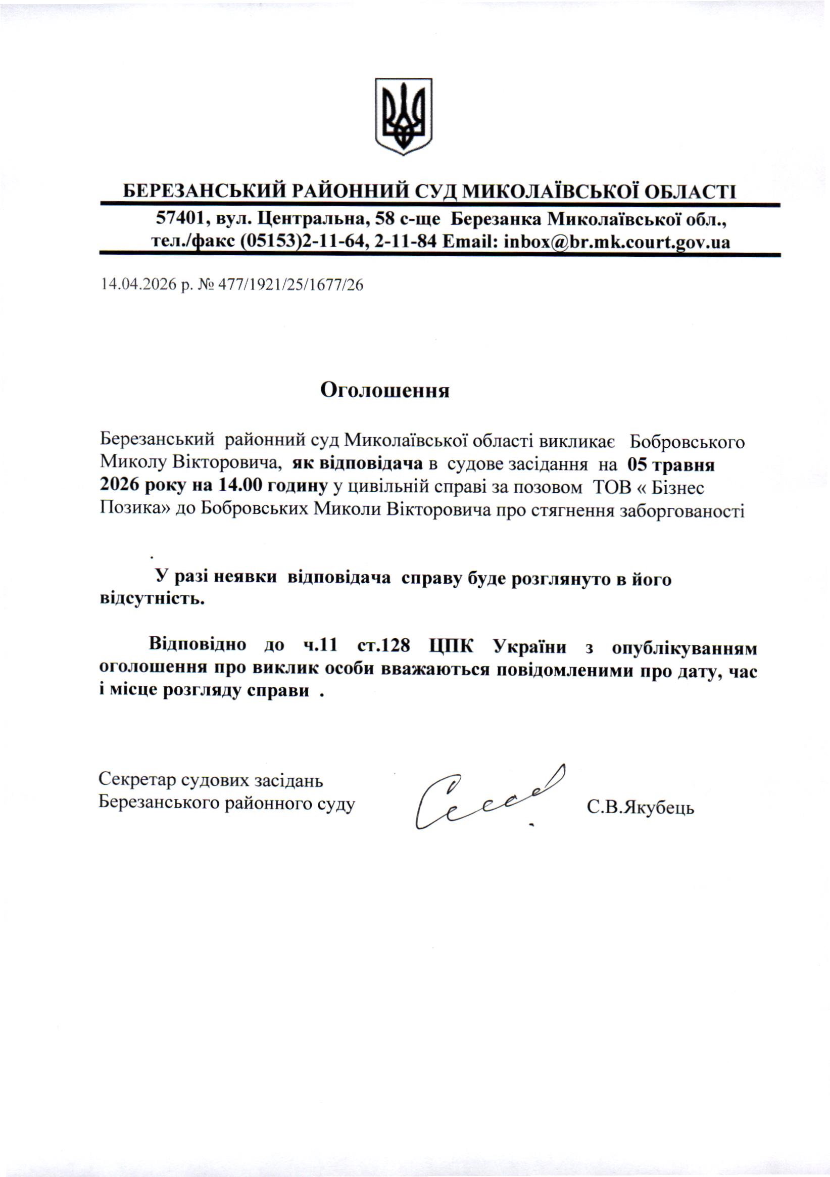 Виклик до суду Бобровського М.В.