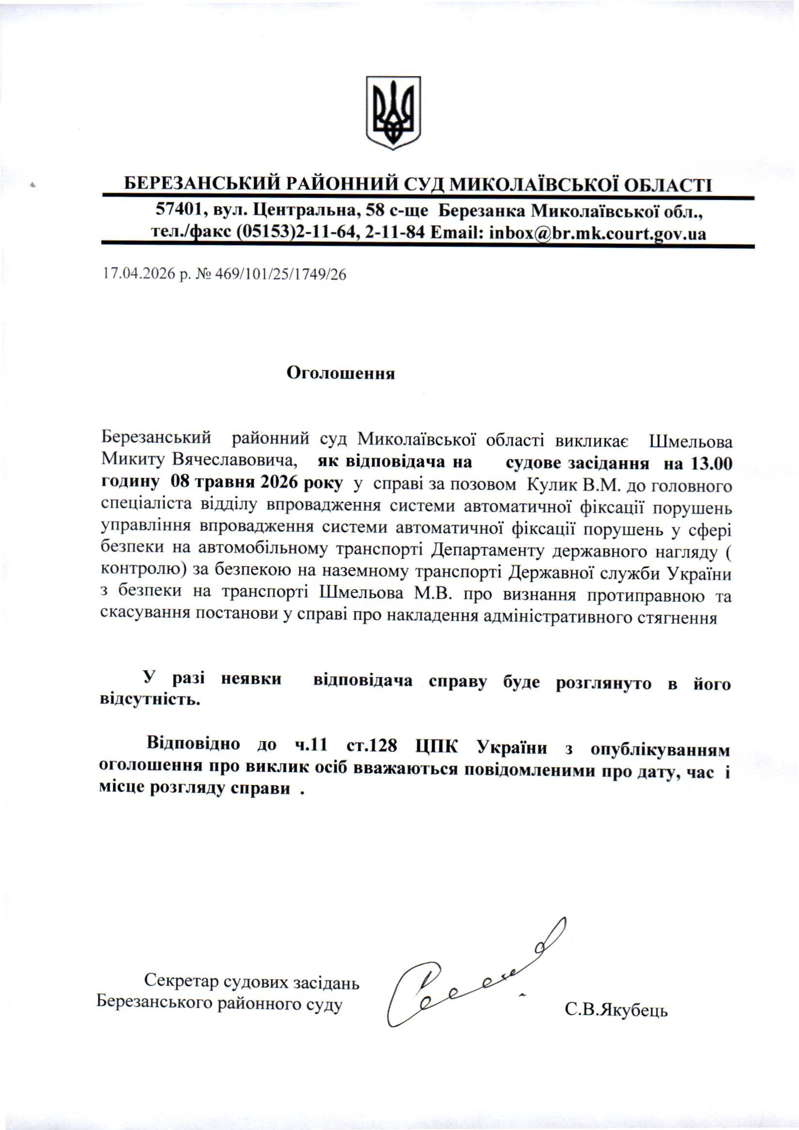 Виклик до суду Шмельова М.В.
